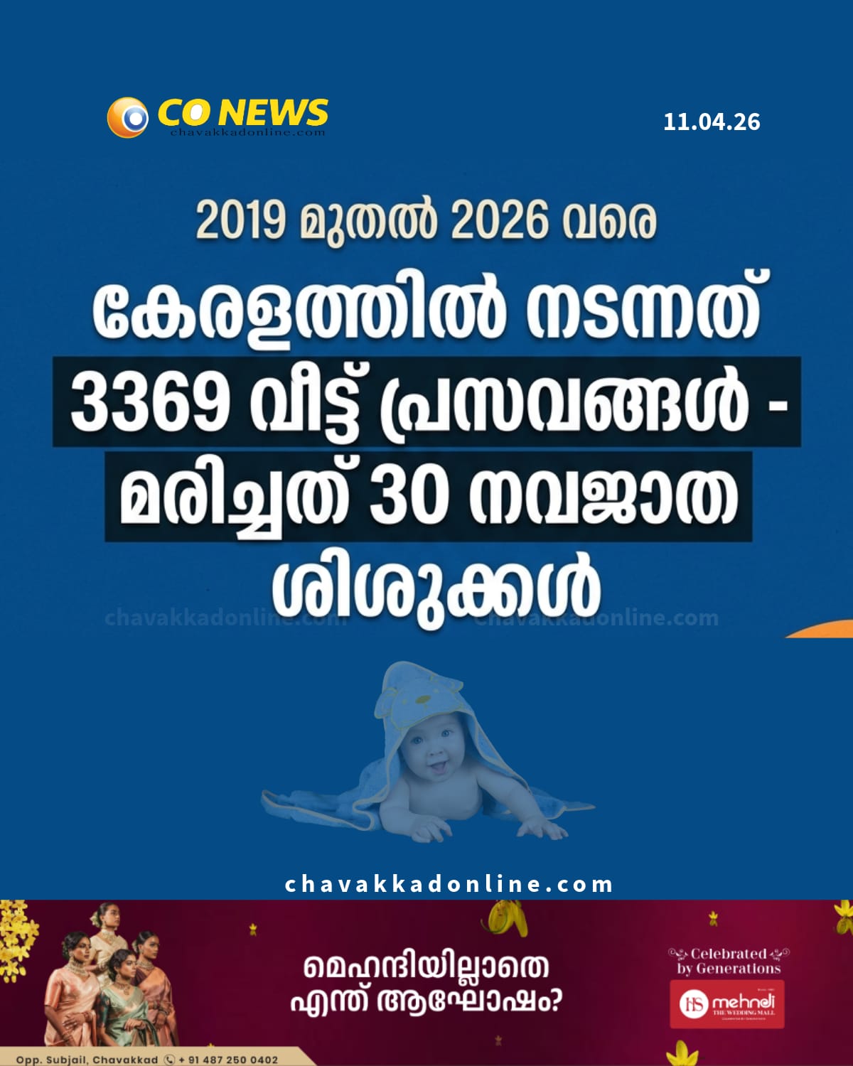 ചാവക്കാട്:  സംസ്ഥാനത്ത് 2019 മുതൽ 2026 വരെ  3369 വീട്ട് പ്രസവങ്ങൾ നടന്നതായി വിവരാവകാശ പ്രകാരം ലഭിച്ച രേഖകളിൽ വ്യക്തമാക്കുന്നു. 30 നവജാത ശിശുക്കൾ ഈ കാലയളവിൽ മരിച്ചിട്ടുണ്ട്. 2025 ജനുവരി മുതൽ 2026 ജനുവരി വരെ 202 വീട്ട് 9 കുഞ്ഞുങ്ങൾ മരിച്ചതായി സംസ്ഥാനത്ത് റിപ്പോർട്ട് ചെയ്തു.  സംസ്ഥാനത്ത് കഴിഞ്ഞ ജനുവരിയിൽ 14 വീട്ട് പ്രസവങ്ങൾ നടന്നതായി ആരോഗ്യ വകുപ്പിന്റെ കണക്ക് പുറത്ത് വരുമ്പോൾ പ്രസ്തുത കാലയളവിൽ മൂന്ന് നവജാത ശിശുക്കൾ മരണപ്പെട്ടു.
