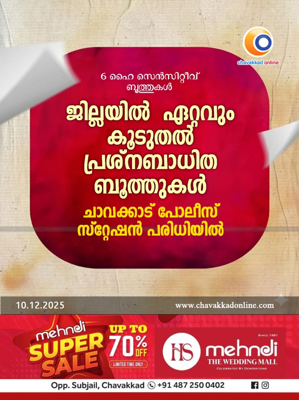 6 ഹൈ സെൻസിറ്റീവ് ബൂത്തുകൾ : ജില്ലയിൽ ഏറ്റവും കൂടുതൽ പ്രശ്നബാധിത ബൂത്തുകൾ ചാവക്കാട് സ്റ്റേഷൻ പരിധിയിൽ