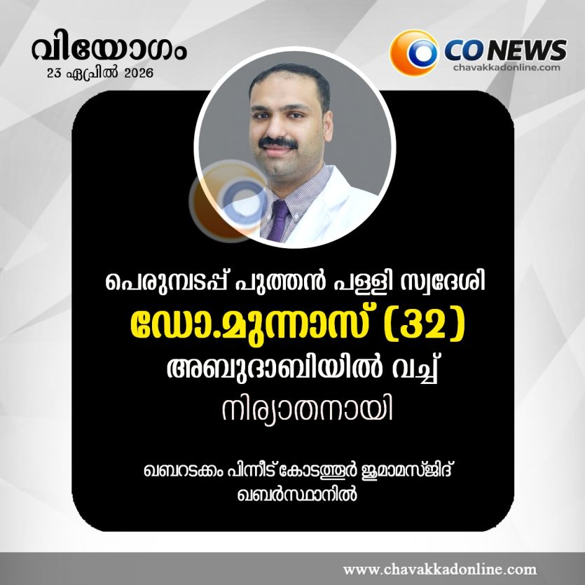അബുദാബി : പെരുമ്പടപ്പ് പുത്തൻ പള്ളി സ്വദേശി ഡോ. മുന്നാസ് (32) അബുദാബിയിൽ വച്ച് നിര്യാതനായി. എൽ എൽ എച്ച് ഹോസ്പിറ്റൽ ജീവനക്കാരനായിരുന്നു. മുസഫ ഇസത്തുൽ ഇസ്ലാം മദ്റസ പി ടി എ അംഗമായിരുന്നു പരേതൻ. പിതാവ് മുഹമ്മദലി. ഭാര്യ: മസ്ന കൊട്ടേക്കാട്, മക്കൾ: ഫാത്തിമ. മഹ്സ മറിയം, തനൂൻ. ജിദ്ദയിലെ ഐസിഎഫ് പ്രവർത്തകൻ വേങ്ങര കെ കെ ലത്തീഫ് ഹാജിയുടെ മരുമകനാണ് മരിച്ച മുന്നാസ്. നടപടിക്രമങ്ങൾ പൂർത്തിയാക്കി മൃതദേഹം നാട്ടിൽ കൊണ്ടുപോകുമെന്നും, കോടത്തൂർ ജുമാമസ്ജിദ് ഖബർസ്ഥാനിൽ സംസ്കരിക്കുമെന്നും ബന്ധപ്പെട്ടവർ അറിയിച്ചു.
