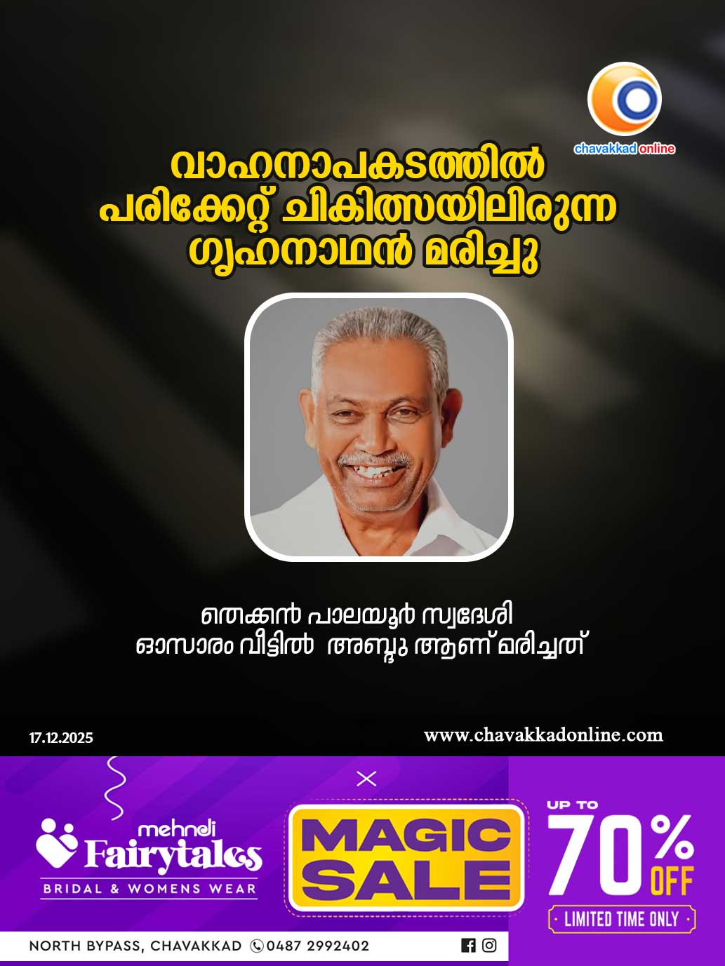 വാഹനാപകടത്തിൽ പരിക്കേറ്റ് ചികിത്സയിലിരുന്ന ഗൃഹനാഥൻ മരിച്ചു