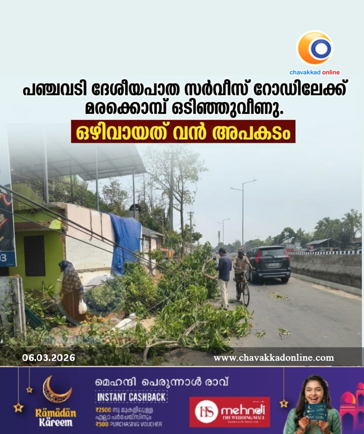 പഞ്ചവടി ദേശീയപാത സർവീസ് റോഡിലേക്ക് മരക്കൊമ്പ് ഒടിഞ്ഞുവീണു