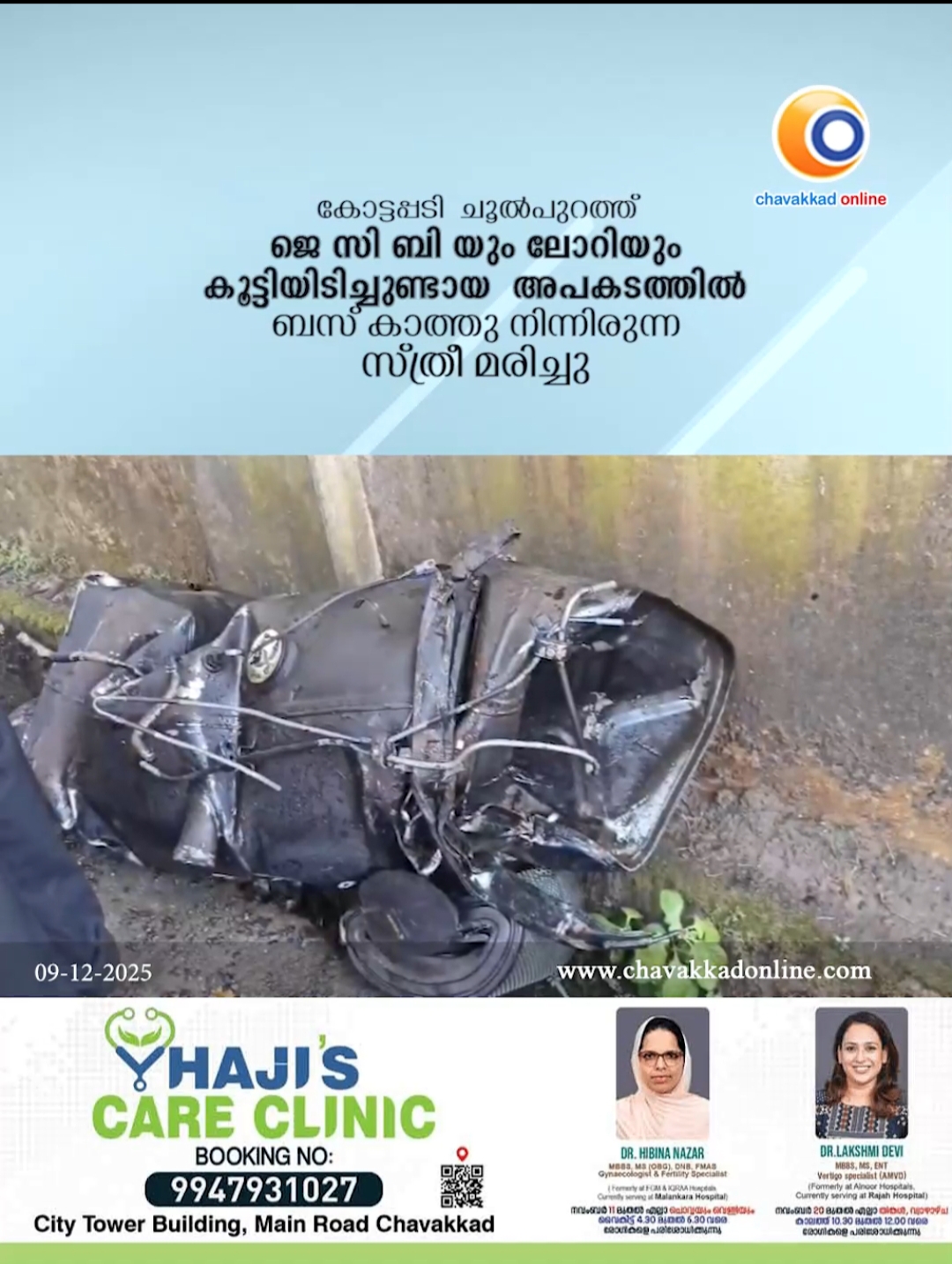 കോട്ടപ്പടി ചൂൽപുറത്ത് ജെസിബി യും ലോറിയും കൂട്ടിയിടിച്ചുണ്ടായ അപകടത്തിൽ ബസ് കാത്തു നിന്നിരുന്ന സ്ത്രീ മരിച്ചു