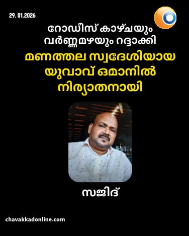 ചാവക്കാട്: മണത്തല പള്ളിതാഴത്ത്. താമസിക്കുന്ന തെരുവത്ത് പീടിയേകൽ ഷാഹു – ജമീല മകൻ സജിദ് ഹൃദയാഘാതം മൂലം ഒമാനിൽ നിര്യാതനായി.ക്ലബ് അംഗം മരിച്ചതിനെ തുടർന്ന് മണത്തല പള്ളിതാഴം റോഡീസ് കാഴ്ച നിർത്തിവെച്ചു. നാളെ നടത്താനിരുന്ന നാട്ടുകാരുടെ വർണ്ണമഴയും റദ്ദാക്കി.
