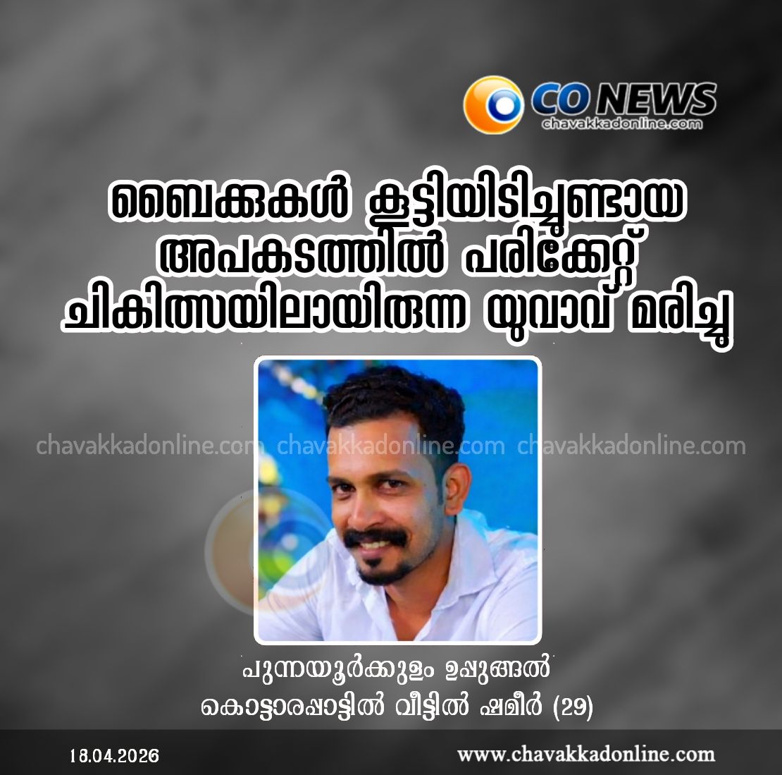 പുന്നയൂർക്കുളം: വേലൂർ ചുങ്കം മാവിൻചുവടിന് സമീപം ബൈക്കുകൾ കൂട്ടിയിടിച്ചുണ്ടായ അപകടത്തിൽ പരിക്കേറ്റ് ചികിത്സയിലായിരുന്ന യുവാവ് മരിച്ചു. പുന്നയൂർക്കുളം ഉപ്പുങ്ങൽ കൊട്ടാരപ്പാട്ടിൽ വീട്ടിൽ ഷമീർ (29) ആണ് അന്തരിച്ചത്. കഴിഞ്ഞ ചൊവ്വാഴ്ച രാത്രിയിലായിരുന്നു അപകടം നടന്നത്.അപകടത്തിൽ സാരമായി പരിക്കേറ്റ ഷമീറിനെ ഉടൻ തന്നെ തൃശൂർ മെഡിക്കൽ കോളേജ് ആശുപത്രിയിൽ പ്രവേശിപ്പിച്ചിരുന്നു. തുടർന്ന് വിദഗ്ധ ചികിത്സയ്ക്കായി എറണാകുളത്തെ സ്വകാര്യ ആശുപത്രിയിലേക്ക് മാറ്റി. അവിടെ ചികിത്സയിൽ തുടരവെയാണ് മരണം സംഭവിച്ചത്. മൃതദേഹം പോസ്റ്റ്മോർട്ടം നടപടികൾക്ക് ശേഷം ബന്ധുക്കൾക്ക് വിട്ടുനൽകും.