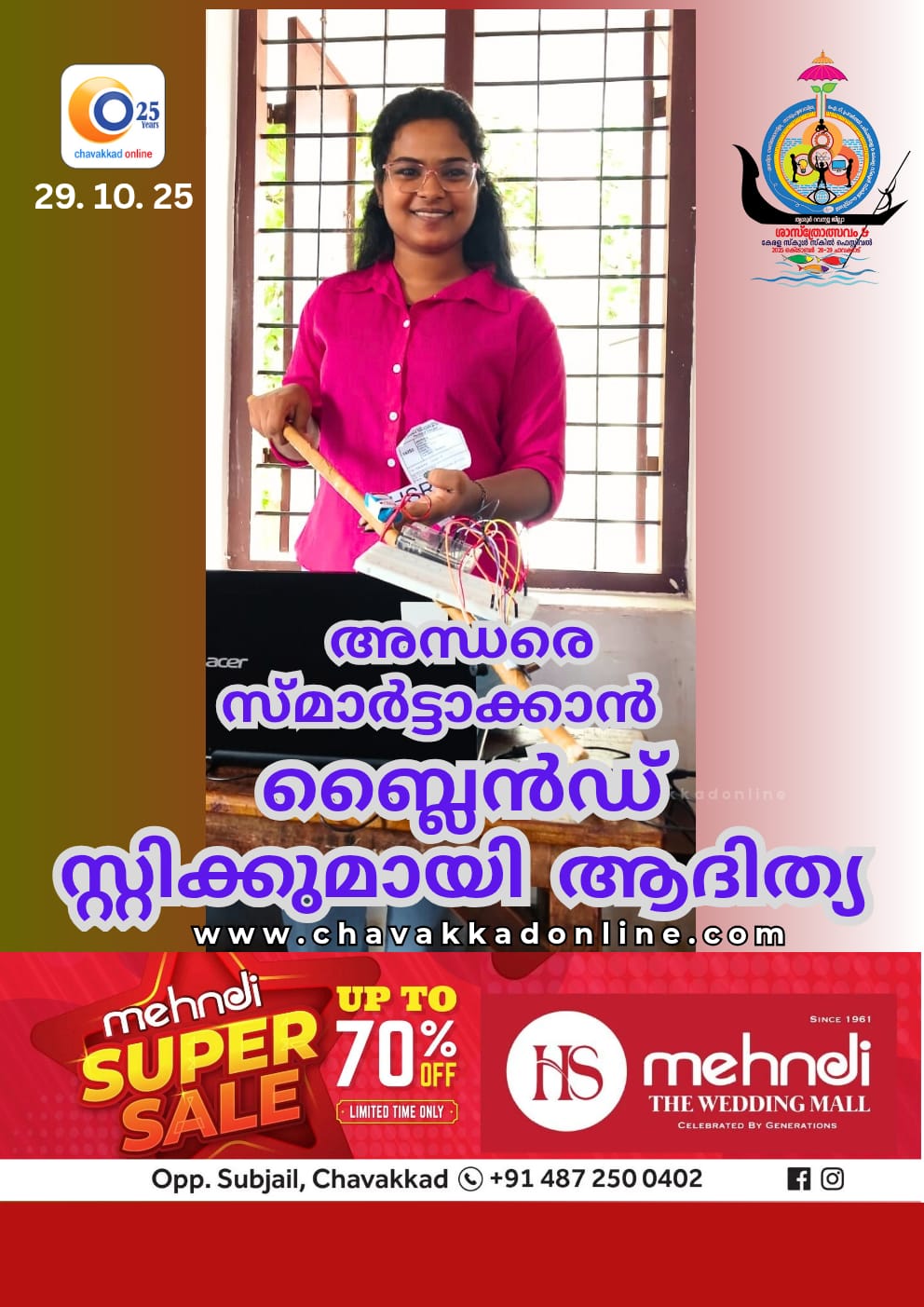 ചാവക്കാട്: അന്ധർക്ക് തടസ്സങ്ങൾ മറികടന്നു മുന്നോട്ട് പോകാനുള്ള സ്മാർട് സ്റ്റിക് അവതരിപ്പിച്ച് ബ്രഹ്മകുളം സെന്റ് തെരെസാസ് ഹൈസ്കൂളിലെ പത്താം ക്ലാസ് വിദ്യാർത്ഥി കെ ആദിത്യ. മുന്നിലുള്ള തടസ്സങ്ങളും കുഴികളും മുൻകൂട്ടി അറിഞ്ഞു സുരക്ഷിതമായി മുന്നോട്ട് സഞ്ചരിക്കാൻ ഈ സ്റ്റിക് അന്ധരെ സഹായിക്കും. ശബ്ദമായും വൈബ്രേറ്റ് ആയും മുന്നറിയിപ്പ് നൽകാനുള്ള സംവിധാനങ്ങൾ ഒരുക്കിയിട്ടുണ്ട്. കൂടുതൽ പഠനങ്ങൾ നടത്തി മെച്ചപ്പെട്ട ഒരു സ്മാർട് സ്റ്റിക് അന്ധർക്കായി തയ്യാറാക്കാനുള്ള ശ്രമം തുടരുമെന്ന് ആദിത്യ പറഞ്ഞു.