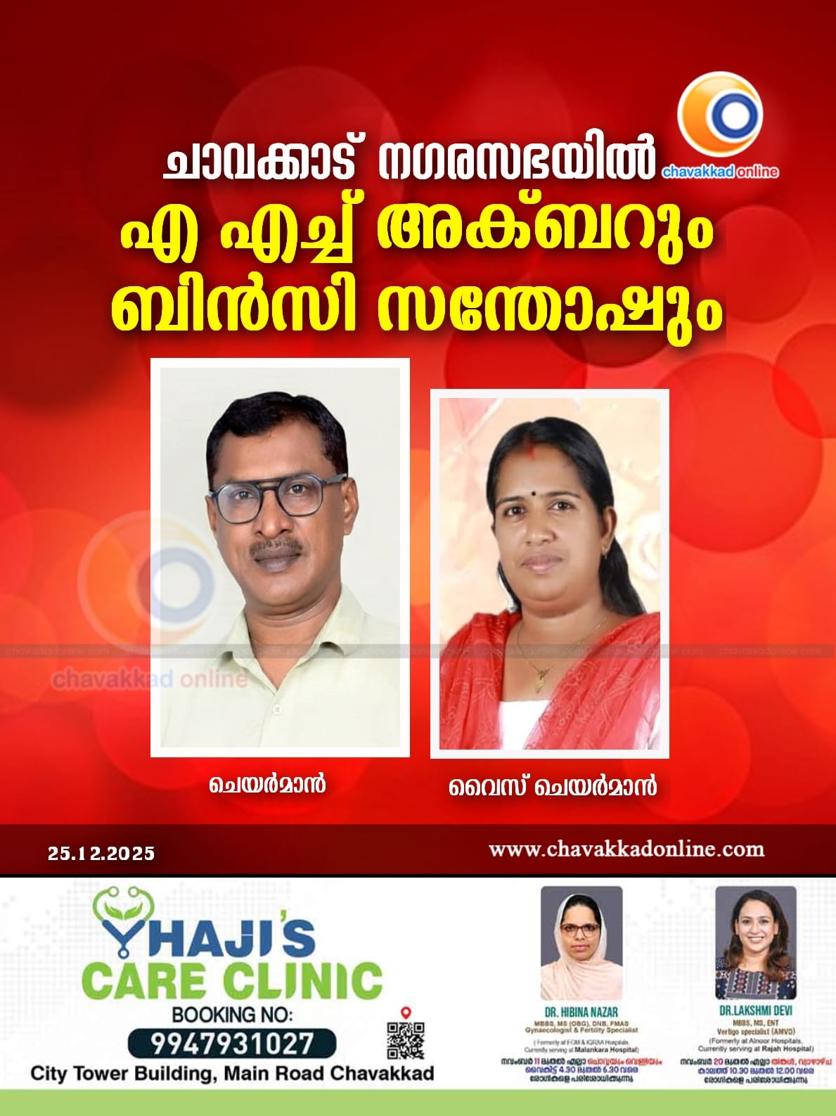 ചാവക്കാട് നഗരസഭയിൽ എ എച് അക്ബറും ബിൻസി സന്തോഷും ചെയർമാനും വൈസ് ചെയർമാനും