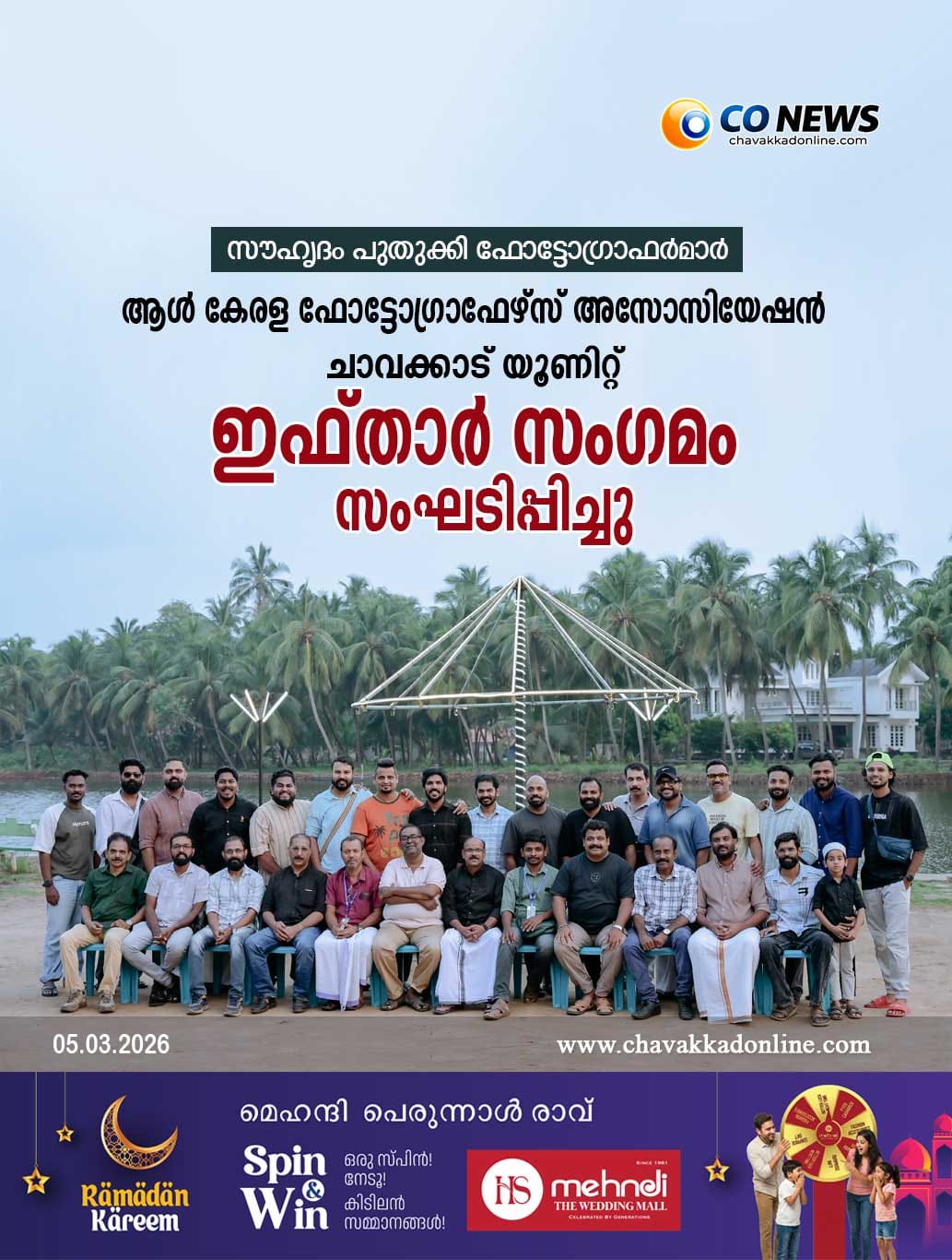 ചാവക്കാട്: ആൾ കേരള ഫോട്ടോഗ്രാഫേഴ്സ് അസോസിയേഷൻ (AKPA) ചാവക്കാട് യൂണിറ്റിന്റെ ഇഫ്താർ സംഗമം ശ്രദ്ധേയമായി. മാട്ടുമ്മൽ നാലുമണിക്കാറ്റിൽ വെച്ച് നടന്ന ചടങ്ങിൽ യൂണിറ്റിലെ അംഗങ്ങൾ പങ്കുചേർന്നു. യൂണിറ്റ് പ്രസിഡന്റ് ആർ.പി മുഹമ്മദ് ഇസ്മായിൽ അധ്യക്ഷത വഹിച്ച ചടങ്ങ് മേഖല പ്രസിഡന്റ് കെ.കെ മധുസൂദനൻ ഉദ്ഘാടനം ചെയ്തു.