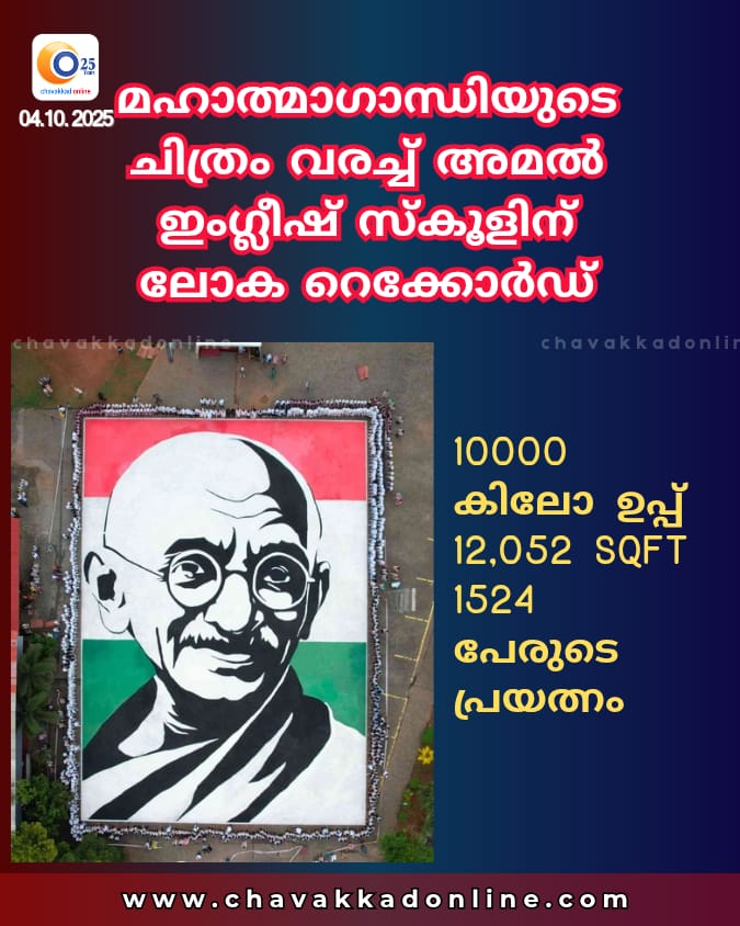 പുന്നയൂർക്കുളം: 10000 കിലോഗ്രാം ഉപ്പുകൊണ്ട് 12,052 ചതുരശ്ര അടി വിസ്തീർണ്ണത്തിൽ മഹാത്മാഗാന്ധിയുടെ ഛായാചിത്രം നിർമ്മിച്ച് അമൽ ഇംഗ്ലീഷ് സ്കൂളിലെ വിദ്യാർത്ഥികളും അധ്യാപകരും ‘ബിഗ്ഗെസ്റ്റ് സാൾട്ട് പോട്രേറ്റ് ഓഫ് മഹാത്മ ഗാന്ധി’ ടാലന്റ് റെക്കോർഡ് ബുക്കിന്റെ വേൾഡ് റെക്കോർഡ് കരസ്ഥമാക്കി. അമൽ ഇംഗ്ലീഷ് സ്കൂളിലെ ചിത്രകല അധ്യാപകൻ പ്രജിത്തിന്റെ നേതൃത്വത്തിൽ വിദ്യാർത്ഥികളും, അധ്യാപകരും, നോൺ ടീച്ചിംഗ് സ്റ്റാഫ് എന്നിവർ ഉൾപ്പെടെ 1524 പേർ ചേർന്ന് 6 മണിക്കൂർ കൊണ്ടാണ് ഈ ഛായാചിത്രം ചിത്രം പൂർത്തിയാക്കിയത്.
