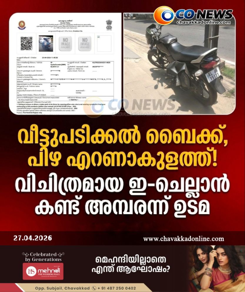 ചാവക്കാട്: സ്വന്തം ബൈക്ക് വീട്ടുമുറ്റത്ത് വിശ്രമിക്കുമ്പോൾ, കിലോമീറ്ററുകൾക്കപ്പുറം എറണാകുളത്ത് വെച്ച് ഗതാഗത നിയമം ലംഘിച്ചെന്ന് കാട്ടി പിഴയടക്കാൻ സന്ദേശം ലഭിച്ചതിന്റെ അമ്പരപ്പിലാണ് മുനക്കക്കടവ് സ്വദേശിയായ പൊതുപ്രവർത്തകൻ ഷറഫുദ്ധീൻ. എറണാകുളം സിറ്റി പോലീസിന്റെ പേരിൽ വന്ന ഈ ‘വിചിത്ര’ ചെല്ലാൻ ഇപ്പോൾ സോഷ്യൽ മീഡിയയിലടക്കം ചർച്ചയാവുകയാണ്.കഴിഞ്ഞ വെള്ളിയാഴ്ച രാവിലെ പാലാരിവട്ടത്ത് വെച്ച് ബൈക്കിന്റെ പിന്നിലിരുന്ന ആൾ ഹെൽമെറ്റ് ധരിച്ചില്ലെന്ന് കാണിച്ചാണ് എറണാകുളം സിറ്റി പോലീസിന്റെ പേരിൽ സന്ദേശം വന്നത്. ഇദ്ദേഹത്തിന്റെ ഉടമസ്ഥതയിലുള്ള വാഹനത്തിന് 500 രൂപയാണ് പിഴ ചുമത്തിയിരിക്കുന്നത്.സന്ദേശം ലഭിച്ചതിനെത്തുടർന്ന് മോട്ടോർ വാഹന വകുപ്പിന്റെ ഔദ്യോഗിക വെബ്സൈറ്റിൽ പരിശോധിച്ചപ്പോഴാണ് കൂടുതൽ വൈരുദ്ധ്യങ്ങൾ ശ്രദ്ധയിൽപ്പെട്ടത്. വെബ്സൈറ്റിൽ നൽകിയിരിക്കുന്ന ചിത്രത്തിൽ ഒരു പുരുഷനും സ്ത്രീയും സ്കൂട്ടറിൽ യാത്ര ചെയ്യുന്നതാണുള്ളത്. എന്നാൽ പരാതിക്കാരന്റെ ഉടമസ്ഥതയിലുള്ളത് ബൈക്കാണ്. മാത്രമല്ല, ചിത്രത്തിലെ സ്കൂട്ടറിന്റെ നമ്പർ പ്ലേറ്റ് ഒട്ടും വ്യക്തവുമല്ല.നമ്പർ പ്ലേറ്റ് വ്യക്തമല്ലാത്ത മറ്റൊരു വാഹനത്തിന് ലഭിക്കേണ്ട പിഴ, വാഹന നമ്പറുമായുള്ള സാമ്യം മൂലം ഉദ്യോഗസ്ഥർ തെറ്റായി രേഖപ്പെടുത്തിയതാകാമെന്നാണ് കരുതുന്നത്. യാതൊരു പരിശോധനയുമില്ലാതെ പിഴ ചുമത്തുന്ന ഇത്തരം നടപടികൾ സാധാരണക്കാരെ ബുദ്ധിമുട്ടിക്കുന്നതാണെന്ന് അദ്ദേഹം പറഞ്ഞു. അശാസ്ത്രീയമായ രീതിയിൽ പിഴ ചുമത്തിയ നടപടിക്കെതിരെ ഷറഫുദ്ധീൻ അധികൃതർക്ക് പരാതി നൽകി.