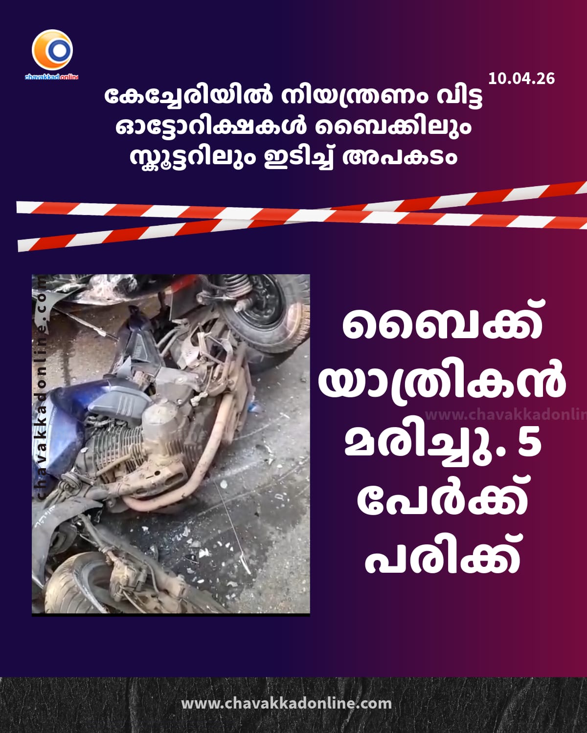 കേച്ചേരിയിൽ നിയന്ത്രണം വിട്ട ഓട്ടോറിക്ഷകൾ ബൈക്കിലും സ്കൂട്ടറിലും ഇടിച്ച് ബൈക്ക് യാത്രികൻ മരിച്ചു. 5 പേർക്ക് പരിക്ക്