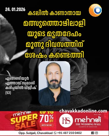 ചാവക്കാട് : മത്സ്യബന്ധനത്തിനിടെ വള്ളത്തിൽ നിന്ന് കടലിലേക്ക് തെറിച്ചു വീണ് കാണാതായ മത്സ്യത്തൊഴിലാളിയുടെ മൃതദേഹം മൂന്നു ദിവസത്തിന് ശേഷം കണ്ടെത്തി. ഏങ്ങണ്ടിയൂർ എത്തായ് സ്വദേശി കരിപ്പയിൽ വിജീഷ് (53)ആണ് കടലിൽ വീണ് മരിച്ചത്. 21 ന് പുലർച്ചെ 5.30 ഓടെയായിരുന്നു സംഭവം. വിജേഷ് അടക്കം അഞ്ചു പേർ അടങ്ങുന്ന മത്സ്യ തൊഴിലാളികൾ ചേറ്റുവ ഹാർബറിൽ നിന്ന് ശിവശക്തി എന്ന ഫൈബർ വള്ളത്തിലാണ് മത്സ്യബന്ധനത്തിന് പോയത്. ശക്തമായ കാറ്റിൽ ആടിയുലഞ്ഞ വള്ളത്തിൽ നിന്ന് ചേറ്റുവ അഴിമുഖത്ത് നിന്നും പടിഞ്ഞാറു മാറി അഞ്ചങ്ങാടി വളവിന് പടിഞ്ഞാറ് പത്ത് കിലോമീറ്റർ അകലെ വെച്ച് വിജീഷ്കടലിലേക്ക് തെറിച്ചു വീഴുകയായിരുന്നു. കൂടെയുണ്ടായിരുന്നവർ തിരച്ചിൽ നടത്തിയെങ്കിലും കണ്ടെത്തിയില്ല. തുടർന്ന് ഫിഷറീസ് വകുപ്പും കോസ്റ്റൽ പൊലീസും തിരച്ചിൽ നടത്തിയെങ്കിലും കണ്ടെത്താൻ കഴിഞ്ഞില്ല. കപ്പൽ ഉപയോഗിച്ചും തിരച്ചിൽ നടത്തിയിരുന്നു.