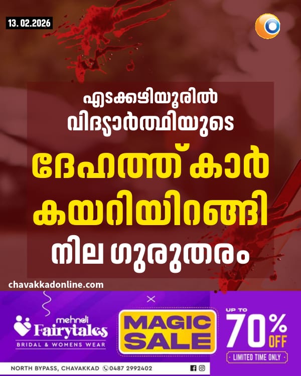 എടക്കഴിയൂരിൽ വിദ്യാർത്ഥിയുടെ ദേഹത്ത് കാർ കയറിയിറങ്ങി; നില ഗുരുതരം