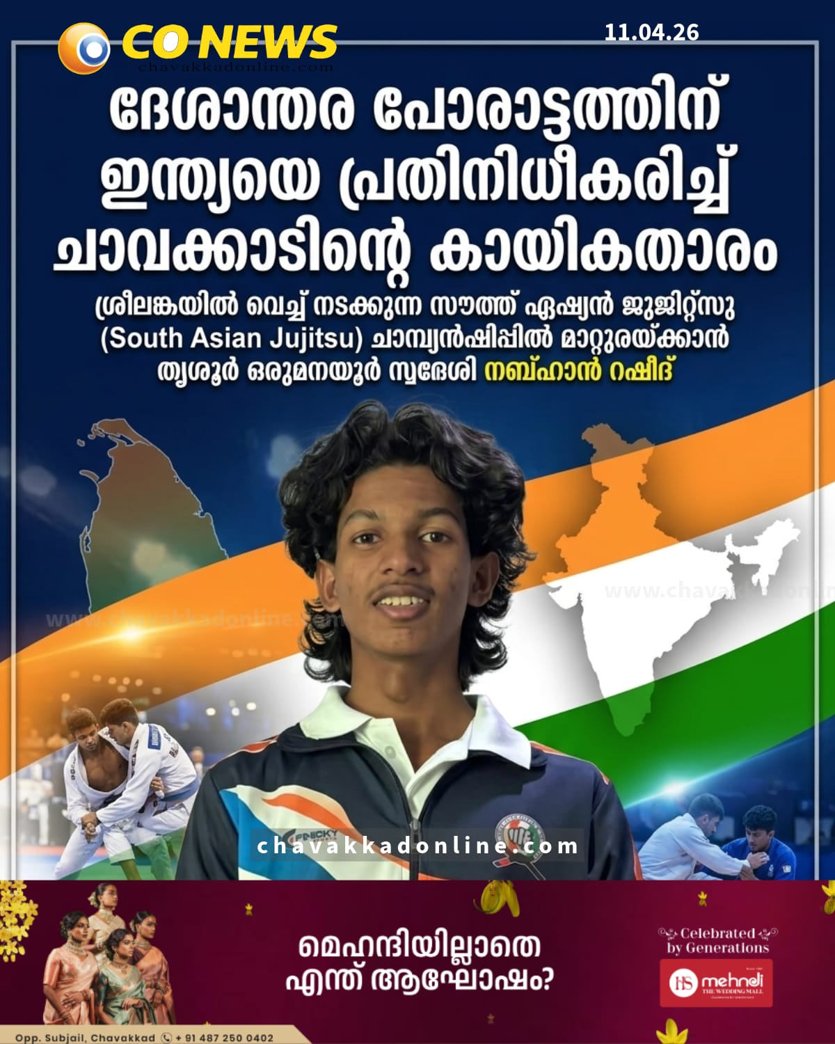 ഒരുമനയൂർ : ചാവക്കാടിന്റെ കായിക ഭൂപടത്തിന് അഭിമാനമായി ഒരുമനയൂർ സ്വദേശി നബ്ഹാൻ റഷീദ് അന്താരാഷ്ട്ര തലത്തിലേക്ക്. ശ്രീലങ്കയിൽ നടക്കുന്ന സൗത്ത് ഏഷ്യൻ ജുജിറ്റ്സു ചാമ്പ്യൻഷിപ്പിൽ നബ്ഹാൻ ഇന്ത്യയെ പ്രതിനിധീകരിക്കും. അണ്ടർ 18 വിഭാഗത്തിൽ 48 കിലോ കാറ്റഗറിയിലാണ് താരം മത്സരിക്കുന്നത്.ദേശീയ കോച്ച് ആർ.ജെ അൻവർ മരക്കാറുടെ കീഴിൽ വെങ്കിടങ്ങ് എസ്.ടി.എം.എ അക്കാദമിയിൽ നിന്നാണ് നബ്ഹാൻ പരിശീലനം നേടിയത്. ഗാസിയാബാദിലെ ദേശീയ ട്രയൽസിലെ മികച്ച പ്രകടനം നബ്ഹാന് ഇന്ത്യൻ ടീമിലേക്കുള്ള വഴി തുറന്നു. ഇന്നും നാളെയുമായി (ഏപ്രിൽ 11, 12 ) നടക്കുന്ന മത്സരത്തിൽ പങ്കെടുക്കാൻ നബ്ഹാൻ കഴിഞ്ഞ ദിവസം ഡൽഹിയിൽ എത്തി ഇന്ത്യൻ ടീമിനോടൊപ്പം ചേർന്നു. നബ്ഹാന്റെ ഈ നേട്ടത്തിൽ നാട്ടുകാരും വെങ്കിടങ്ങ് എസ്.ടി.എം.എ അക്കാദമിയും ആഹ്ലാദത്തിലാണ്.