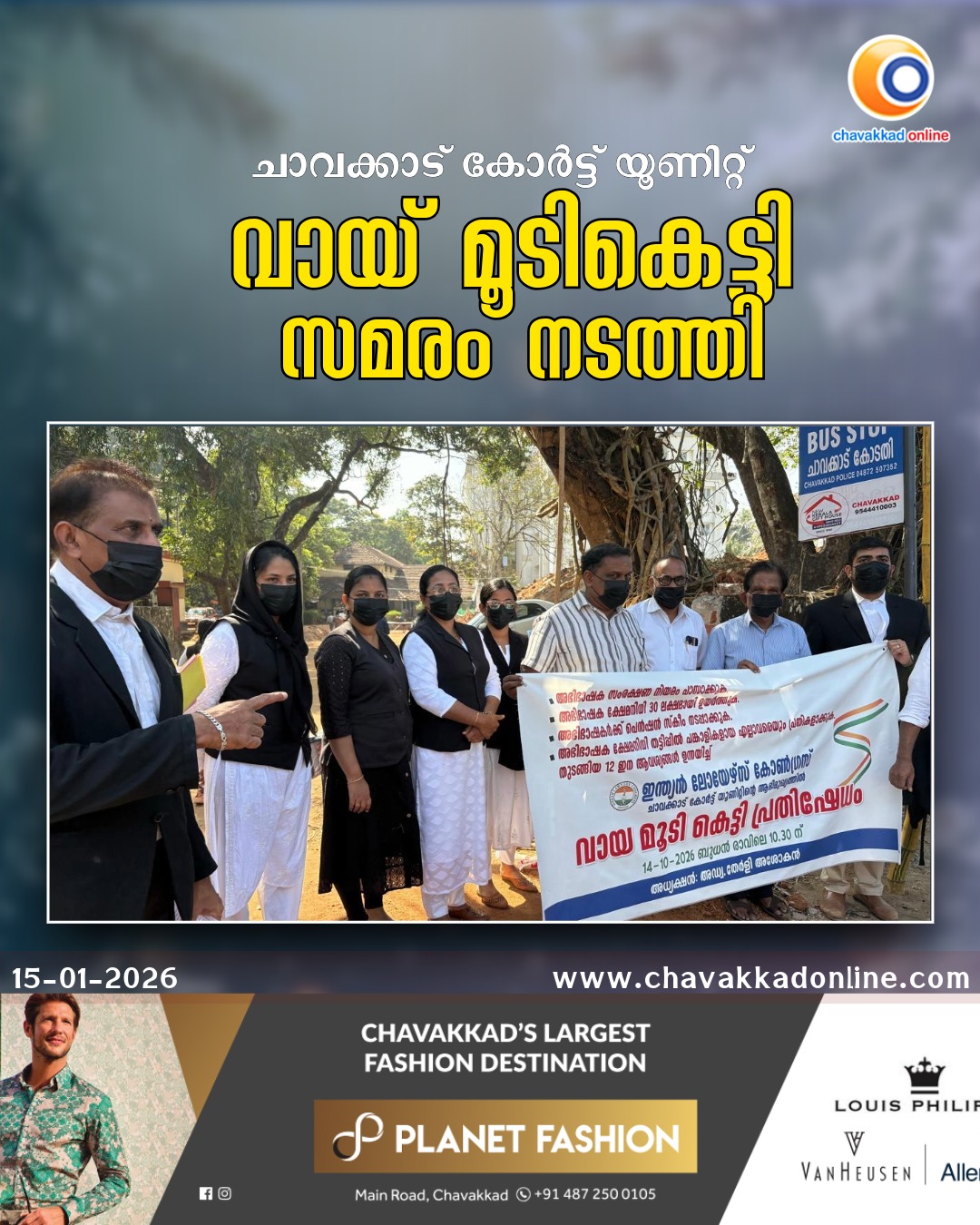 ചാവക്കാട് :ഇന്ത്യൻ ലോയേഴ്സ് കോൺഗ്രസ് ചാവക്കാട് കോർട്ട് യൂണിറ്റിന്റെ ആഭിമൂഖ്യത്തിൽ വായ് മൂടി കെട്ടി സമരം നടത്തി . അഭിഭാഷക സംരക്ഷണ നിയമം പാസാക്കുക , അഭിഭാഷക ക്ഷേമ നിധി 30 ലക്ഷമായി ഉയർത്തുക , അഭിഭാഷകർക്ക് പെൻഷൻ സ്കീം നടപ്പാക്കുക , അഭിഭാഷക ക്ഷേമ നിധി തട്ടിപ്പിൽ പങ്കാളികളായവർ എല്ലാവരെയും പ്രതികളാക്കുക , ജൂനിയർ അഭിഭാഷകർക്ക് സ്റ്റൈപ്പൻഡ് ഏർപ്പെടുത്തുക, അന്യായമായി വർദ്ധിപ്പിച്ച കോർട്ട് ഫീ പിൻവലിക്കുക തുടങ്ങിയ 12 ആവശ്യങ്ങൾ ഉന്നയിച്ചാണ് ചാവക്കാട് കോടതി കോംപ്ലക്സിൽ പ്രതിഷേധം നടത്തിയത് .