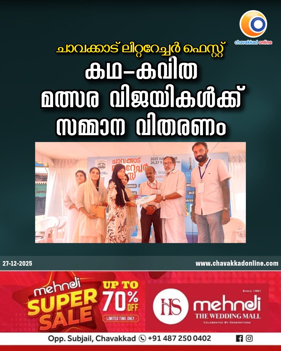 ചാവക്കാട് : ചാവക്കാട് രണ്ടു ദിവസങ്ങളിലായി നടന്നുവന്ന ലിറ്ററേച്ചർ ഫെസ്റ്റിവലിന്റെ ഭാഗമായി വിദ്യാർത്ഥികൾക്കായി സംഘടിപ്പിച്ച കഥ-കവിത മത്സരങ്ങളിൽ വിജയിച്ചവർക്കുള്ള സമ്മാനങ്ങൾ വിതരണം ചെയ്തു. എഴുത്തുകാരൻ അഷ്റഫ് കാനാപ്പുള്ളി സമ്മാനങ്ങൾ വിദ്യാർത്ഥികൾക്ക് കൈമാറി. സാഹിത്യാഭിരുചിയും സൃഷ്ടിപരമായ കഴിവുകളും വളർത്തുന്നതിന് ലക്ഷ്യമിട്ടായിരുന്നു മത്സരം സംഘടിപ്പിച്ചത്. വിദ്യാർത്ഥികളുടെ പങ്കാളിത്തവും രചനകളിലെ വൈവിധ്യവും ശ്രദ്ധേയമായിരുന്നു.