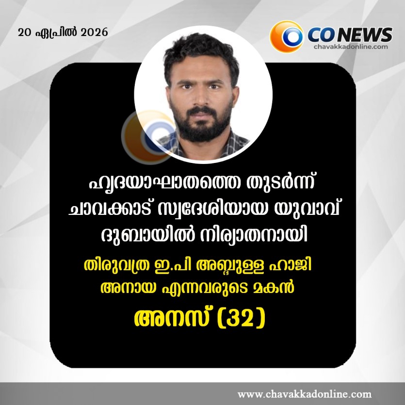 ദുബായ്: ചാവക്കാട് തിരുവത്ര സ്വദേശിയായ യുവാവ് ദുബായിൽ ഹൃദയാഘാതം മൂലം നിര്യാതനായി. തിരുവത്ര ഇ.പി. അബ്ദുള്ള ഹാജി – അനായ ദമ്പതികളുടെ മകൻ അനസ് (32) ആണ് ഇന്ന് പുലർച്ചെ രണ്ട് മണിയോടെ അന്തരിച്ചത്. ഫാത്തിമ്മ ഗ്രൂപ്പ് ഇ.പി. മൂസാഹാജിയുടെ സഹോദര പുത്രനാണ് പരേതൻ.