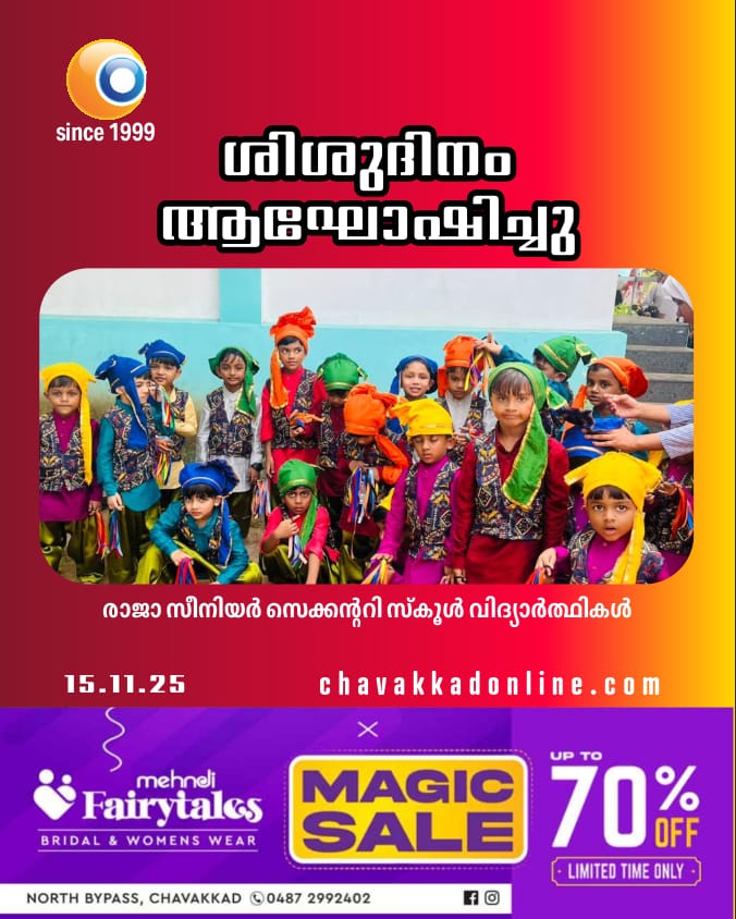 ചാവക്കാട് : രാജാ സീനിയർ സെക്കന്ററി സ്കൂളിൽ ശിശുദിനം വിപുലമായ രീതിയിൽ ആഘോഷിച്ചു. പ്രീകെജി വിദ്യാർത്ഥിനിയായ റൻസ ഷെസ്ലിൻ ഉദ്ഘാടനം നിർവഹിച്ചു. പ്രിൻസിപ്പാൾ ഷമീം ബാവ അധ്യക്ഷത വഹിച്ചു മാനേജർ മധുസൂദനൻ തലപ്പിള്ളി ആശംസ അർപ്പിച്ചു.