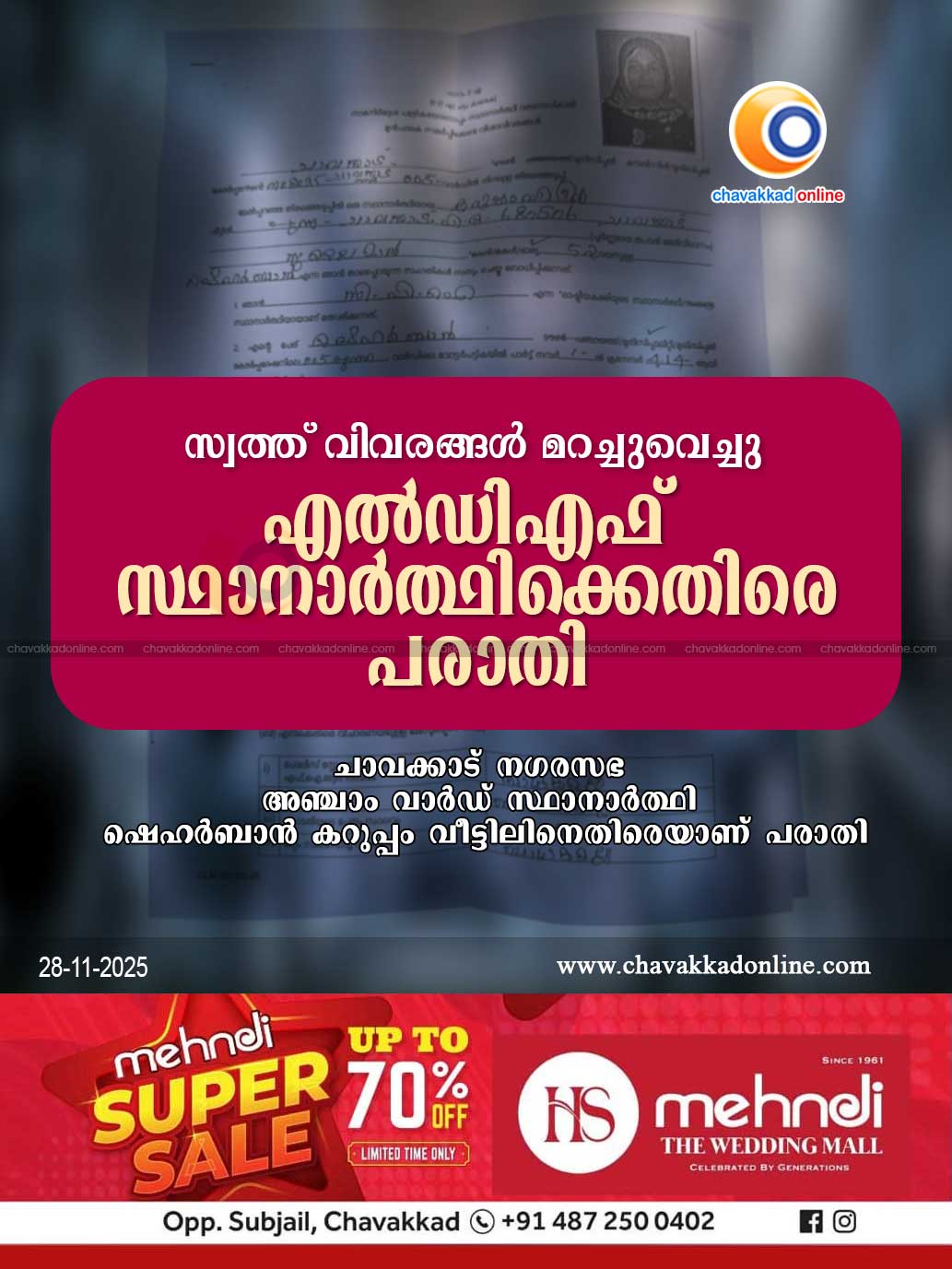 ചാവക്കാട് : ചാവക്കാട് നഗരസഭ അഞ്ചാം വാർഡ് സ്ഥാനാർത്ഥി ഷെഹർബാൻ കറുപ്പം വീട്ടിൽ വ്യാജ സത്യവാങ്മൂലം നൽകിയതായി പരാതി. ഗുരുവായൂർ നഗരസഭയിൽ ഇരുപത്തിമൂന്നാം വാർഡിൽ 155 വീട്ടു നമ്പറിൽ വോട്ടും ഭർത്താവായ സുലൈമാൻ എന്നിവരുടെ പേരിൽ വീടും സ്വത്തും ഉണ്ട് എന്നത് മറച്ചുവെച്ചാണ് സ്ഥാനാർത്ഥി സത്യവാങ്മൂലം നൽകിയത്.
