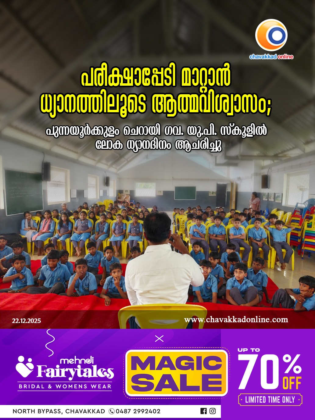 പുന്നയൂർക്കുളം: ലോക ധ്യാന ദിനത്തോടനുബന്ധിച്ച് പുന്നയൂർക്കുളം ചെറായി ഗവ. യു.പി. സ്കൂളിൽ അർദ്ധ വാർഷിക പരീക്ഷയെഴുതുന്ന ഒന്നാം ക്ലാസ് മുതൽ ഏഴാം ക്ലാസ് വരെയുള്ള വിദ്യാർത്ഥികൾക്ക് ധ്യാന പരിശീലനവും ബോധവൽക്കരണ ക്ലാസ്സും സംഘടിപ്പിച്ചു. പരീക്ഷാപ്പേടി അകറ്റി ശ്രദ്ധയോടെ പഠിക്കാനും ആത്മവിശ്വാസത്തോടെ പരീക്ഷയെഴുതാനും ലക്ഷ്യമിട്ടായിരുന്നു പരിപാടി.