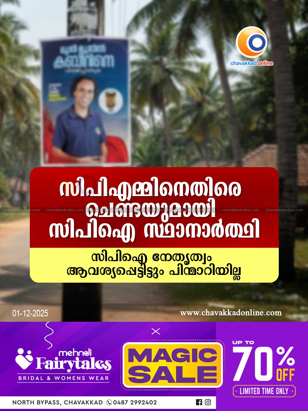 സി പി എമ്മിനെതിരെ ചെണ്ടയുമായി സിപിഐ സ്ഥാനാർഥി – സി പി ഐ നേതൃത്വം ആവശ്യപ്പെട്ടിട്ടും പിന്മാറിയില്ല