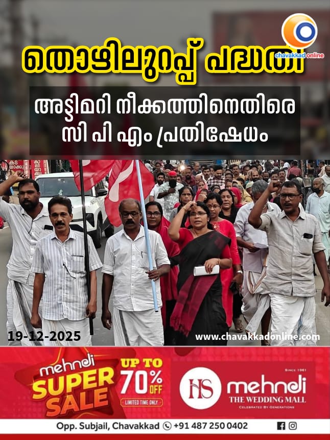 ചാവക്കാട്: മഹാത്മാ ഗാന്ധി ഗ്രാമീണ തൊഴിലുറപ്പ് പദ്ധതി അട്ടിമറിക്കാനുള്ള കേന്ദ്ര സർക്കാർ നീക്കത്തിനെതിരെ സിപിഎമ്മിന്റെ നേതൃത്വത്തിൽ പ്രതിഷേധം പ്രകടനം നടത്തി. മണത്തല ഹോച്മിൻ സാംസ്കാരിക കേന്ദ്രത്തിൽ നിന്നും ആരംഭിച്ച പ്രകടനം ചാവക്കാട് നഗരം ചുറ്റി സെന്ററിൽ സമാപിച്ചു.
