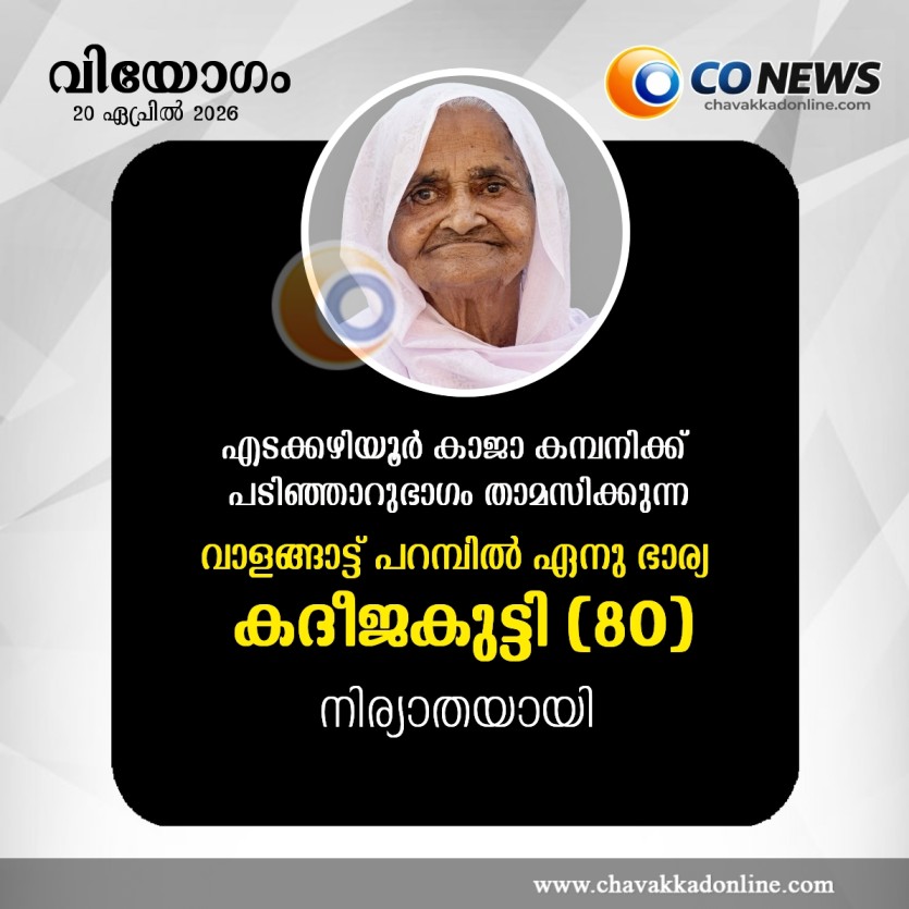 General വിയോഗം By From the desk Last updated Apr 20, 2026 Share എടക്കഴിയൂർ: കാജാ കമ്പനിക്ക് പടിഞ്ഞാറുഭാഗം താമസിക്കുന്ന വാളങ്ങാട്ട് പറമ്പിൽ ഏനു ഭാര്യ കദീജകുട്ടി (80) അന്തരിച്ചു. മക്കൾ: ബക്കർ, മുഹമ്മദ്അലി, ഫൈസൽ, റാബിയ, റംലമരുമക്കൾ : ജെമീല,ഐസകുഞ്ഞി, നെസിറ,വീരാഉ, അസിസ് ChavakkadDeathEdakazhiyur Share FacebookTwitterGoogle+ReddItWhatsAppPinterestEmail