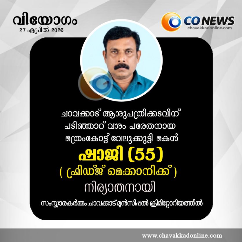 General വിയോഗം By From the desk Last updated Apr 27, 2026 Share ചാവക്കാട്: ആശുപത്രിക്കടവിന് പടിഞ്ഞാറ് വശം, പരേതനായ മത്രംകോട്ട് വേലുക്കുട്ടി മകൻ, (ഫ്രിഡ്ജ് മെക്കാനിക്ക്) ഷാജി (55) നിര്യാതനായി. സംസ്കാരകർമ്മം ഇന്ന് ഉച്ചയ്ക്ക് 2 മണിക്ക് ചാവക്കാട് മുൻസിപ്പൽ ക്രിമിറ്റോറിയത്തിൽ. ChavakkadDeath Share FacebookTwitterGoogle+ReddItWhatsAppPinterestEmail