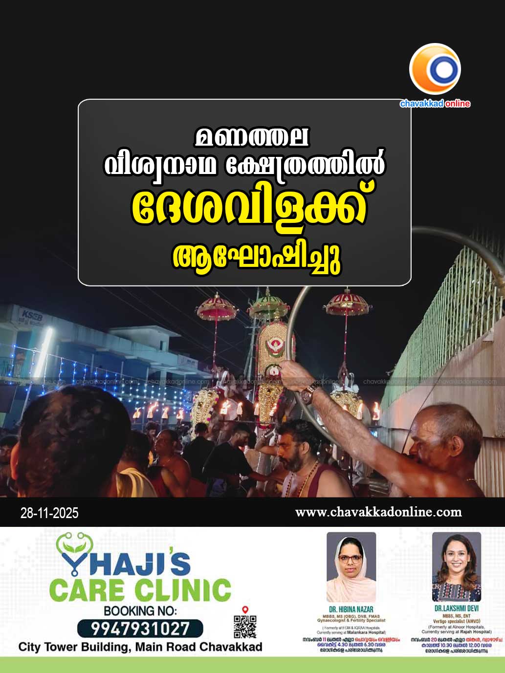ചാവക്കാട്: മണത്തല വിശ്വനാഥ ക്ഷേത്രത്തില് ഗുരുപാദപുരി അയ്യപ്പസ്വാമി സേവാ സംഘത്തിന്റെ നേതൃത്വത്തില് തത്ത്വമസി ഗള്ഫ് കമ്മിറ്റിയുടെ ദേശവിളക്ക് മഹോത്സവം ആഘോഷിച്ചു. രാവിലെ 9ന് വിളക്കുപന്തലില് ആശാ സുരേഷിന്റെ സോപാന സംഗീതാര്ച്ചന നടന്നു. വൈകീട്ട് ബ്ലാങ്ങാട് കല്ലുങ്ങല് ഭഗവതി ക്ഷേത്രത്തില് നിന്ന് ഉടുക്ക് പാട്ട്, ചിന്തുപാട്ട്, കാവടികള്, നാദസ്വരം, പഞ്ചവാദ്യം, ആന, നാടന് കലാരൂപങ്ങള്, തുള്ളല്, തങ്കരഥം തുടങ്ങിയവയുടെ അകമ്പടിയോടെ 500 പേരുടെ താലത്തോട് കൂടിയുള്ള പാലക്കൊമ്പ് എഴുന്നള്ളിപ്പ് ക്ഷേത്രത്തിലേക്ക് പുറപ്പെട്ടു. രാത്രി 9.30 ഓടെ പാലക്കൊമ്പ് എഴുന്നള്ളിപ്പ് ക്ഷേത്രാങ്കണത്തിൽ എത്തിച്ചേർന്നു. തുടർന്ന് ദീപാരാധനയ്ക്ക് ശേഷം ഭക്തിഗാന മേള, തിരി ഉഴിച്ചില്, പാല്ക്കിണ്ടി എഴുന്നള്ളിപ്പ്, കനലാട്ടം, വെട്ടുതട തുടങ്ങിയവ ഉണ്ടായി. ഉച്ചയ്ക്കും രാത്രിയിലുമായി പതിനായിരം പേര്ക്ക് അന്നദാനവും ഉണ്ടായിരുന്നു.