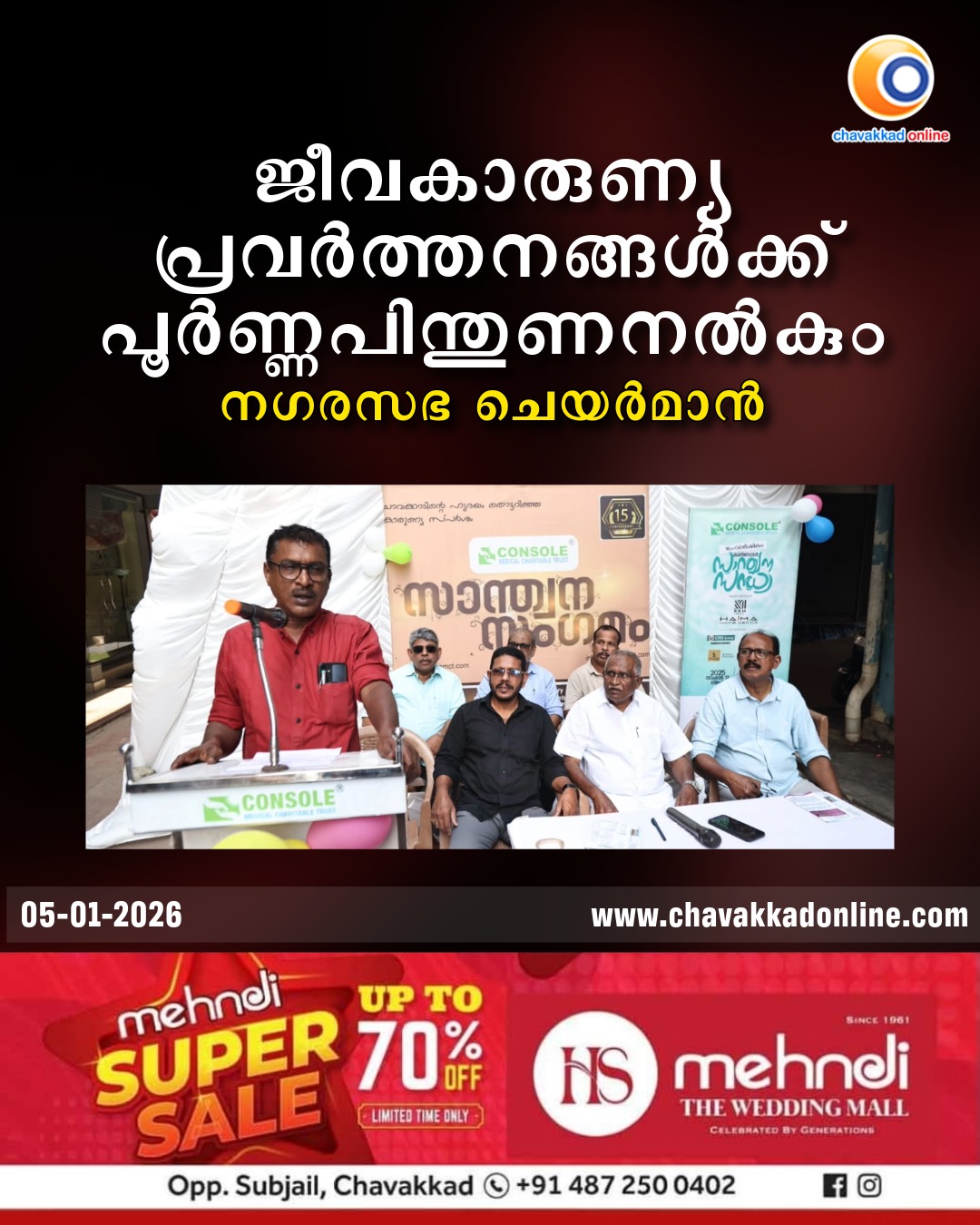 ചാവക്കാട്: ജീവകാരുണ്യ പ്രവർത്തനങ്ങൾക്ക് നഗരസഭയുടെ പൂർണ്ണ പിന്തുണയുണ്ടാകുമെന്ന് ചാവക്കാട് നഗരസഭ ചെയർമാൻ എ. എച്ച്. അക്ബർ വാഗ്ദാനം ചെയ്തു.​ കൺസോൾ മെഡിക്കൽ ചാരിറ്റബിൾ ട്രസ്റ്റിന്റെ പുതുവത്സര സാന്ത്വന സംഗമം ഉദ്ഘാടനം ചെയ്ത് സംസാരിക്കുകയായിരുന്നു അദ്ദേഹം. വലിയ ഒച്ചപ്പാടുകളില്ലാതെ ചാവക്കാട് സജീവമായി പ്രവർത്തിക്കുന്ന കൺസോളുമായി ഏറെ ആത്മബന്ധമുണ്ടെന്നും അദ്ദേഹം പറഞ്ഞു.കൺസോൾ വൈസ് പ്രസിഡന്റ് ഹക്കീം ഇംബാർക്ക് അദ്ധ്യക്ഷത വഹിച്ചു.