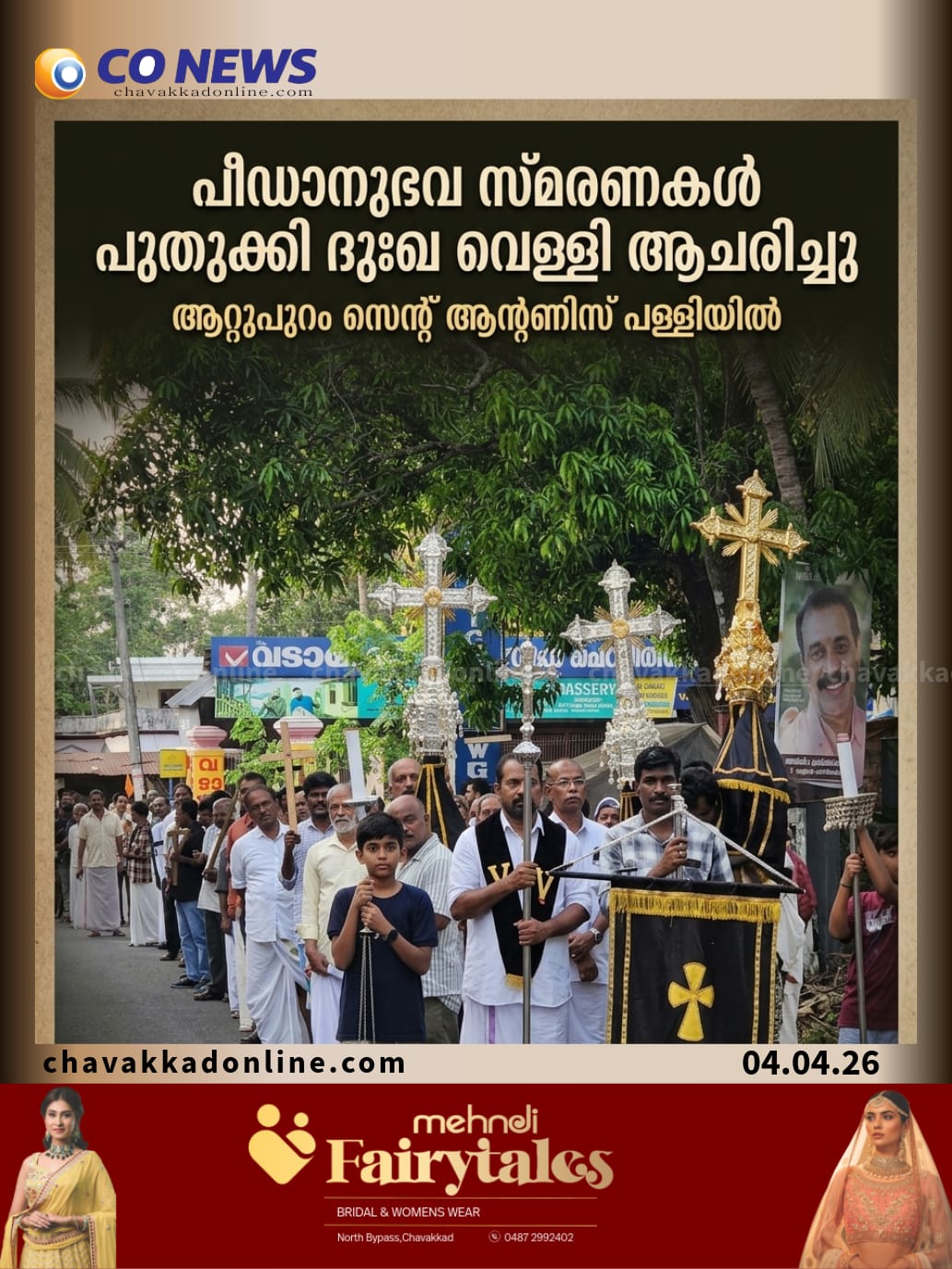പുന്നയൂർകുളം: യേശുവിന്റെ കുരിശു മരണത്തിന്റെ അനുസ്മരണം പുതുക്കി കൊണ്ട് പള്ളികളിൽ തിരുകർമങ്ങളും, പദ യാത്രകളും നടത്തി. ആറ്റുപുറം സെന്റ് ആന്റണിസ് പള്ളിയിൽ പീഡാനുഭവ സ്മരണകൾ പുതുക്കി തിരുകർമങ്ങളും ദിവ്യ കാരുണ്യ പ്രദക്ഷിണവും നടത്തി. വികരി ഫാ. റിജോ വിതയത്തിൽകാർമ്മി കത്വം വഹിച്ചു. വൈകീട്ട് യേശുവിന്റെ മൃതശരീര രൂപം വഹിച്ചുകൊണ്ടുള്ള നഗരി കാണിക്കൽ പദ യാത്ര നടത്തി. പദയാത്രസമാപനത്തിൽ ബ്രദർ. പ്രിൻസ് കിളിയം പ്രായിൽ അനുസ്മരണ സന്ദേശം നൽകി. പദയാത്രക്ക് ട്രസ്റ്റി മാരായ സി. വി. ജേകബ്, സി. ഏ. ബോസ്, എം. ആർ. ഷെജി, കേന്ദ്ര സമിതി കൺവീനർ പി. ഐ. ആന്റോ, ഇടവക സെക്രട്ടറി കെ. ജെ. ജിജോ എന്നിവരും യൂണിറ്റ് ഭാരവാഹികളും നേതൃത്വം നൽകി.