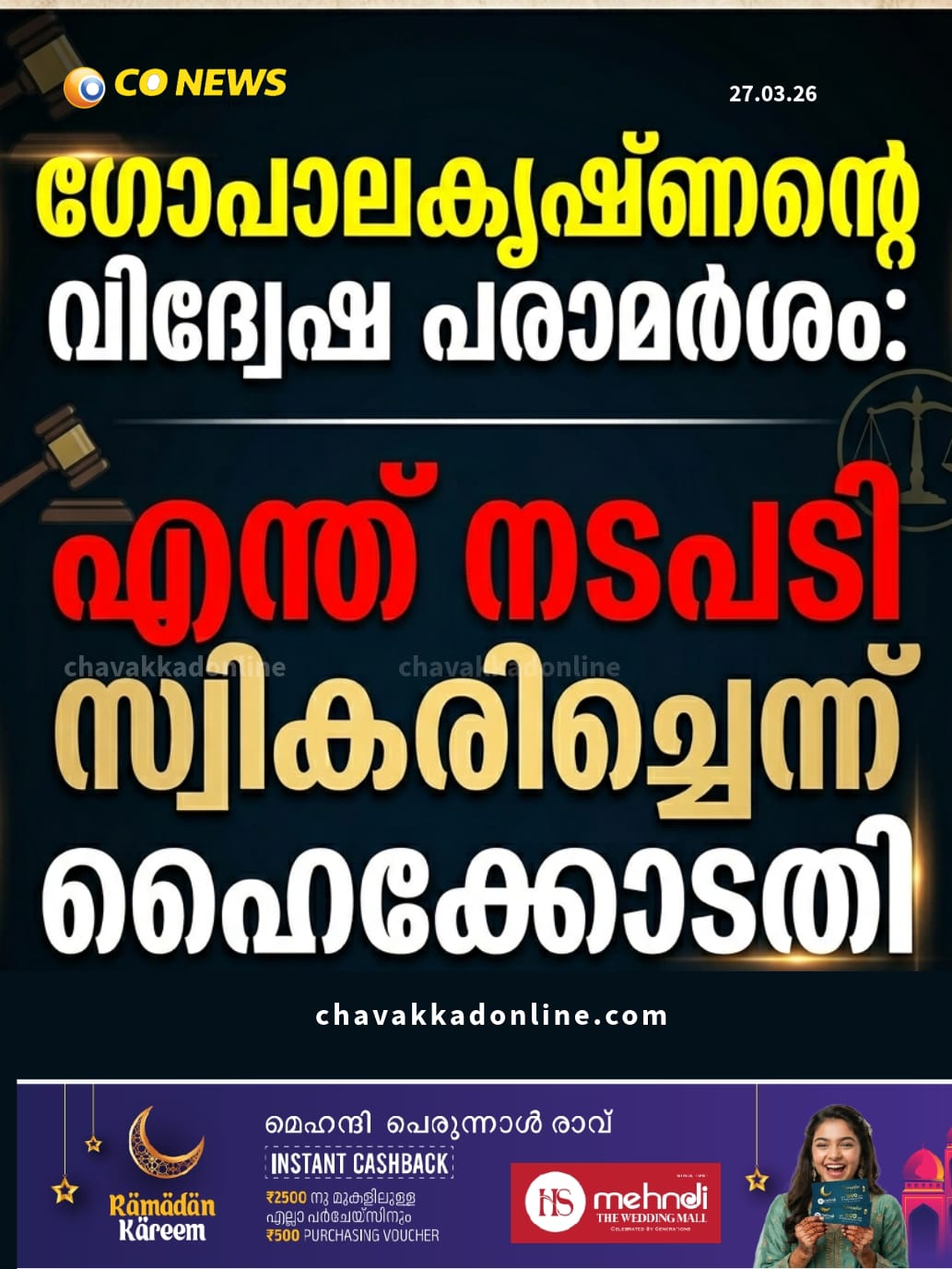 എറണാകുളം: ഗുരുവായൂർ എൻ ഡി എ സ്ഥാനാർഥി ബി. ഗോപാലകൃഷ്ണന്റെ വിദ്വേഷ പരാമർശവുമായി ബന്ധപ്പെട്ട കേസിൽ കേരള ഹൈക്കോടതിയുടെ നിർണായക ഇടപെടൽ. തെരഞ്ഞെടുപ്പ് പ്രചാരണത്തിനിടെ വിദ്വേഷ പരാമർശങ്ങൾ ഉണ്ടാകുമ്പോൾ അത് സമൂഹത്തിലും രാജ്യത്തും ഉണ്ടാക്കുന്ന ആഘാതം ഗൗരവതരമാണെന്ന് കോടതി നിരീക്ഷിച്ചു. ഇത്തരം സംഭവങ്ങളിൽ എന്തുകൊണ്ട് കർശന നടപടി ഉണ്ടാകുന്നില്ലെന്നും മാതൃകാ പെരുമാറ്റച്ചട്ടത്തിന്റെ (MCC) നിയമപരമായ പ്രസക്തി എന്താണെന്നും കോടതി കേന്ദ്ര തെരഞ്ഞെടുപ്പ് കമ്മീഷനോട് ആരാഞ്ഞു. വിവാദ വീഡിയോ സോഷ്യൽ മീഡിയയിൽ നിന്ന് നീക്കം ചെയ്തിട്ടുണ്ടെന്നും സ്ഥാനാർഥിക്കെതിരെ കേസെടുത്തിട്ടുണ്ടെന്നും കമ്മീഷൻ കോടതിയെ അറിയിച്ചു.കെ.എസ്.യു ജില്ലാ നേതാവ് ഗോകുൽ നൽകിയ ഹർജി പരിഗണിച്ചാണ് ജസ്റ്റിസ് ബെച്ചു കുര്യൻ തോമസ് പരാതിയിൽ രണ്ടു മാസത്തിനകം തീരുമാനമെടുക്കാൻ കമ്മീഷന് നിർദേശം നൽകിയത്. ഗുരുവായൂരിൽ 50 വർഷമായി ഹിന്ദു എം.എൽ.എ ഇല്ലെന്നതടക്കമുള്ള ബി. ഗോപാലകൃഷ്ണന്റെ പ്രസ്താവനയാണ് വിവാദമായത്.