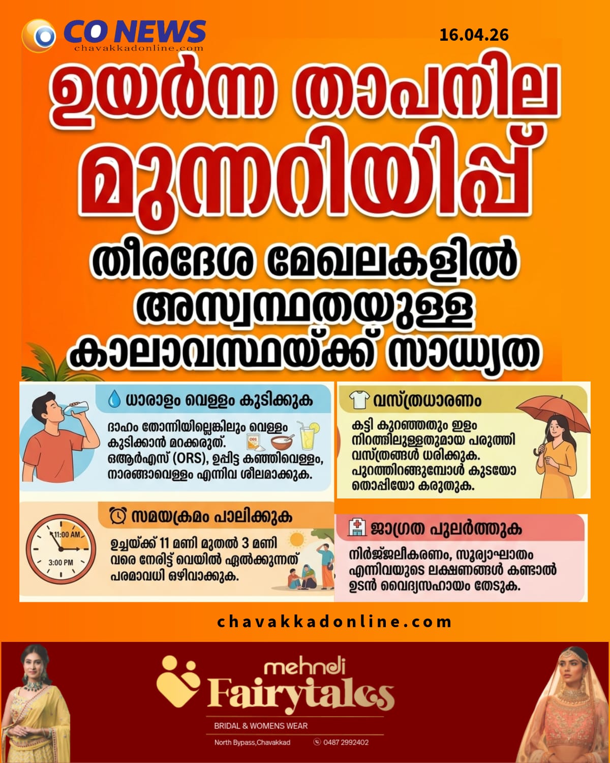 കേരളത്തിൽ ഇന്ന് മുതൽ 19 വരെ ഉയർന്ന താപനില മുന്നറിയിപ്പ്. ഉയർന്ന താപനിലയും ഈർപ്പമുള്ള വായുവും കാരണം തീരദേശ മേഖലകളിൽ ഇന്ന് മുതൽ 19 വരെ ചൂടും അസ്വസ്ഥതയുമുള്ള കാലാവസ്ഥയ്ക്ക് സാധ്യതയുണ്ട്. ചിലയിടങ്ങളിൽ ‘ഫീൽസ് ലൈക്ക്’ (Feels like) താപനില യഥാർത്ഥ താപനിലയേക്കാൾ വളരെ കൂടുതലായിരിക്കും. പാലക്കാട് ജില്ലയിൽ ഉയർന്ന താപനില 40°C വരെയും കൊല്ലം ജില്ലയിൽ ഉയർന്ന താപനില 39°C വരെയും കോട്ടയം ജില്ലയിൽ ഉയർന്ന താപനില 38°C വരെയും; തിരുവനന്തപുരം , പത്തനംതിട്ട, ആലപ്പുഴ, എറണാകുളം, തൃശ്ശൂർ, മലപ്പുറം, കോഴിക്കോട്, കണ്ണൂർ, കാസറഗോഡ് ജില്ലകളിൽ ഉയർന്ന താപനില 37°C വരെയും ഉയരാൻ (സാധാരണയെക്കാൾ 2 to 3˚C വരെ കൂടുതൽ) സാധ്യതയെന്ന് കേന്ദ്ര കാലാവസ്ഥ വകുപ്പ് അറിയിക്കുന്നു.ദാഹം തോന്നിയില്ലെങ്കിലും ധാരാളം വെള്ളം കുടിക്കുക. ഒആർഎസ് (ORS), ഉപ്പിട്ട കഞ്ഞിവെള്ളം, നാരങ്ങാവെള്ളം എന്നിവ കരുതുക.ഉച്ചയ്ക്ക് 11 മണി മുതൽ 3 മണി വരെ നേരിട്ട് വെയിൽ ഏൽക്കുന്നത് പരമാവധി ഒഴിവാക്കുക.കട്ടി കുറഞ്ഞതും ഇളം നിറത്തിലുള്ളതുമായ പരുത്തി വസ്ത്രങ്ങൾ ധരിക്കുക.നിർജ്ജലീകരണം (Dehydration), സൂര്യാഘാതം (Sunstroke) എന്നിവയുടെ ലക്ഷണങ്ങൾ കണ്ടാൽ ഉടൻ വൈദ്യസഹായം തേടുക.ചവക്കാട് ഉൾപ്പെടെയുള്ള തീരദേശ മേഖലകളിൽ ഈ ദിവസങ്ങളിൽ നല്ല ഉഷ്ണവും വിയർപ്പും അനുഭവപ്പെടാൻ സാധ്യതയുള്ളതിനാൽ പ്രത്യേകം ശ്രദ്ധിക്കുക. പുറത്തിറങ്ങുമ്പോൾ കുടയോ തൊപ്പിയോ ഉപയോഗിക്കുന്നത് നല്ലതാണ്.Time of Issue 02.00 PM 16/04/2026