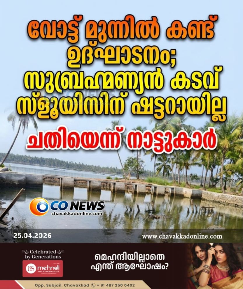 കടപ്പുറം : ഉദ്ഘാടനം കഴിഞ്ഞു രണ്ടുമാസമായിട്ടും കടപ്പുറം സുബ്രഹ്മണ്യൻകടവ് സ്ളൂയിസ് കനാലിനു ഷട്ടറായില്ല. കൃഷിയും കുടിവെള്ളവും നശിക്കും വിധം ഉപ്പ് വെള്ളം കയറുന്നത് തുടരുന്നു. നാട്ടുകാർ പ്രതിഷേധവുമായി രംഗത്ത്. പണിതീരും മുൻപേ വോട്ട് മുന്നിൽ കണ്ടു നടത്തിയ ഉദ്ഘാടനം നാട്ടുകാരോടു കാണിച്ച ചതിയായിരിന്നുവെന്ന് പ്രതിഷേധക്കാർ പറഞ്ഞു. രണ്ടു ദിവസത്തിനുള്ളിൽ ഷട്ടറുകൾ സ്ഥാപിക്കും എന്നാണ് ഉദ്ഘാടന വേളയിൽ എൻ കെ അക്ബർ എം എൽ എ പറഞ്ഞത്. എന്നാൽ രണ്ടു മാസമായിട്ടും 45 ലക്ഷം ചിലവിൽ നിർമിച്ച സ്ളൂയിസ് കനാലിനു ഷട്ടറുകൾ എത്തിയില്ല.കടപ്പുറം രാമാത്ത് ചുള്ളിപ്പാടം മേഖലയിലേക്കും തെക്ക് പ്രദേശങ്ങളിലേക്കും ഉപ്പുവെള്ളം കയറാതിരിക്കാൻ വേണ്ടി ഉണ്ടാക്കിയ സുബ്രഹ്മണ്യൻകടവ് സ്ളൂയിസിന് ഷട്ടറുകൾ ഇല്ലാത്തതിനാൽ ഉപ്പുവെള്ളം കയറ്റ ദുരിതം തുടർക്കഥയാവുകയാണ്. സ്ളൂയിസിന്റെ ആറോളം വരുന്ന ഒന്നര മീറ്ററുകൾ വീതിയുള്ള പഴുതുകളിൽ ഒന്നിലും എഫ് ആർ പി ഷട്ടറുകൾ ഉപയോഗിക്കാത്തതിനാൽ ഉപ്പ് വെള്ളക്കയറ്റം വളരെ ശക്തമാണ്. കടപ്പുറം പഞ്ചായത്ത് വൈസ് പ്രസിഡന്റ് സക്കീന അറക്കൽ, ഒമ്പതാം വാർഡ് മുസ്ലിം ലീഗ് കമ്മിറ്റി പ്രസിഡണ്ട് ആർ വി സലീം, സെക്രട്ടറി പി കെ ഇന്തികാബ് ആലം, ട്രഷറർ പി വി ഹൈദരാലി, ജനപ്രതിനിധികളും സാമൂഹിക പ്രവർത്തകരും പരിസരവാസികളും പ്രതിഷേധത്തിൽ പങ്കെടുത്തു.