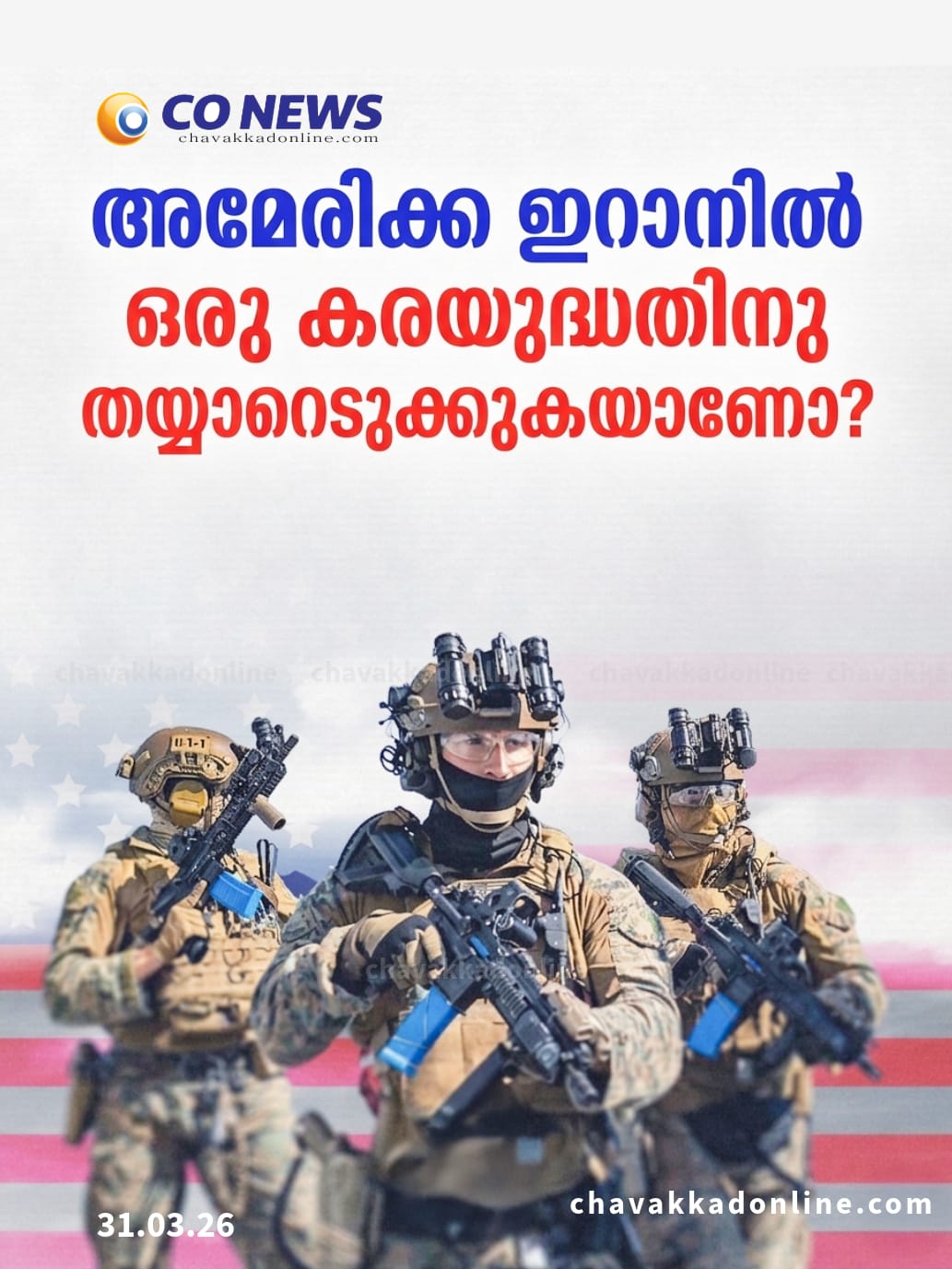 അമേരിക്ക ഇറാനിൽ പരിമിതമായ തോതിലുള്ള കരയുദ്ധത്തിന് (Ground Operations) തയ്യാറെടുക്കുന്നതായി അന്താരാഷ്ട്ര മാധ്യമങ്ങൾ റിപ്പോർട്ട് ചെയ്യുന്നു. ഇറാനിൽ ആഴ്ചകൾ നീണ്ടുനിൽക്കുന്ന കരയുദ്ധത്തിന് പെന്റഗൺ പദ്ധതിയിടുന്നതായി ‘വാഷിങ്ടൻ പോസ്റ്റ്’ റിപ്പോർട്ട് ചെയ്തു. ഇറാനിലെ തീരപ്രദേശങ്ങളും ഖാർഗ് ദ്വീപ് (Kharg Island) പോലുള്ള തന്ത്രപ്രധാന മേഖലകളും കേന്ദ്രീകരിച്ചുള്ള മിന്നലാക്രമണങ്ങൾക്കായിരിക്കും (Raids) സാധ്യത.ഇതിനോടകം തന്നെ ആയിരക്കണക്കിന് യുഎസ് മറീനുകളും സൈനികരും പശ്ചിമേഷ്യയിൽ എത്തിയിട്ടുണ്ട്. ഏകദേശം 10,000 അധിക സൈനികരെ കൂടി മേഖലയിലേക്ക് അയക്കാൻ അമേരിക്ക ആലോചിക്കുന്നതായും റിപ്പോർട്ടുകളുണ്ട്. USS Tripoli എന്ന യുദ്ധക്കപ്പൽ ഇതിനോടകം മേഖലയിൽ നിലയുറപ്പിച്ചു കഴിഞ്ഞു. ഡൊണാൾഡ് ട്രംപ് ഇതുവരെ ഈ പദ്ധതികൾക്ക് ഔദ്യോഗികമായി അനുമതി നൽകിയിട്ടില്ല. എങ്കിലും ചർച്ചകൾ നടക്കുന്നുണ്ടെന്നും “ഒരു ഡീൽ (Deal) ഉണ്ടായില്ലെങ്കിൽ കടുത്ത നടപടികൾ ഉണ്ടാകുമെന്നും” ട്രംപ്. ഇറാന്റെ ആണവ കേന്ദ്രങ്ങൾക്ക് നേരെ യുഎസ് ആക്രമണം നടത്തിയതായും, പകരമായി ദുബായ് തീരത്ത് ഇറാന്റെ ആക്രമണം ഉണ്ടായതായും റിപ്പോർട്ടുകൾ സൂചിപ്പിക്കുന്നു.ഒരു പൂർണ്ണമായ യുദ്ധം പ്രഖ്യാപിക്കപ്പെട്ടിട്ടില്ലെങ്കിലും, ഇറാന്റെ സൈനിക-സാമ്പത്തിക ശേഷി തകർക്കുന്ന രീതിയിലുള്ള പരിമിതമായ കരയുദ്ധത്തിന് അമേരിക്കൻ സൈന്യം തയ്യാറെടുക്കുന്നു എന്നാണ് നിലവിലെ സാഹചര്യം വ്യക്തമാക്കുന്നത്