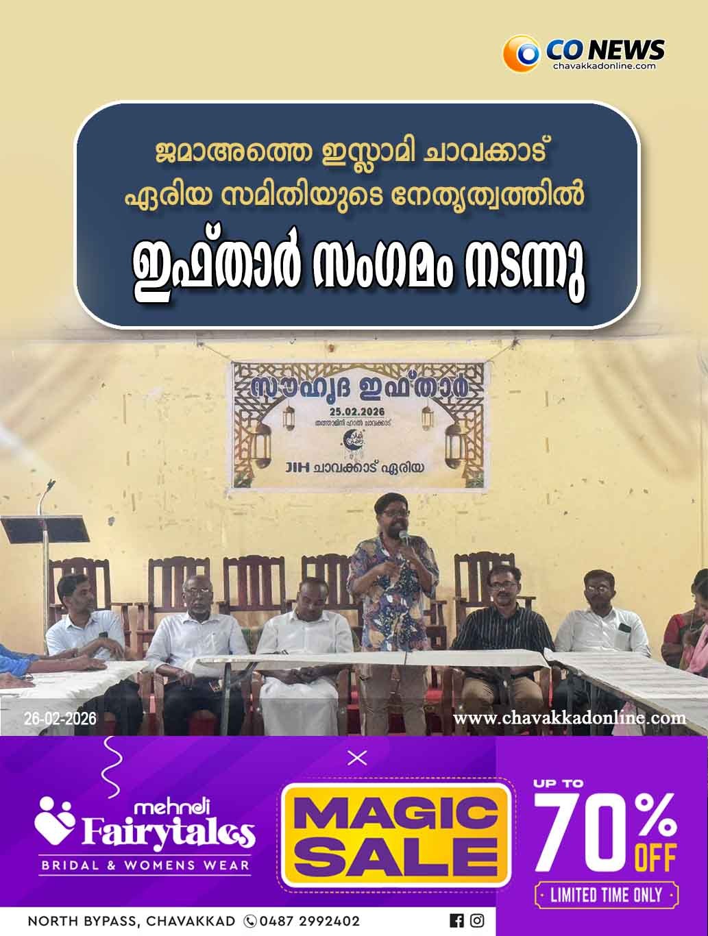 ചാവക്കാട് : ജമാഅത്തെ ഇസ്ലാമി ചാവക്കാട് ഏരിയാ സമിതിയുടെ നേതൃത്വത്തിൽ ഇഫ്താർ സംഗമം ഡോക്ടർ സക്കീർ ഹുസൈൻ റമളാനിൻ്റെ ചൈതന്യം എന്ന വിഷയത്തെ കുറിച്ച് മുഖ്യ പ്രഭാഷണം നടത്തി. കൗൺസിലർമാരായ സുജാത സത്യൻ, ഷെർമിള സത്താർ, ഗായത്രി, എം എൽ. ജോസഫ് സൈമൺ മാസ്റ്റർ, ഫിറോസ് തൈപ്പറമ്പിൽ, മുൻ കൗൺസിലർ സത്താർ, മാധ്യമ പ്രവർത്തക പാർവതി, കെ. ഷംസുദ്ദീൻ, തുടങ്ങിയവർ സംസാരിച്ചു. എരിയ പ്രസിഡൻ്റ് ജഅഫർ അധ്യക്ഷത വഹിച്ചു. എം.കെ സലാഹുദ്ദീൻ സ്വാഗതവും ഷാജി മുതുവട്ടൂർ നന്ദിയും പറഞ്ഞു.