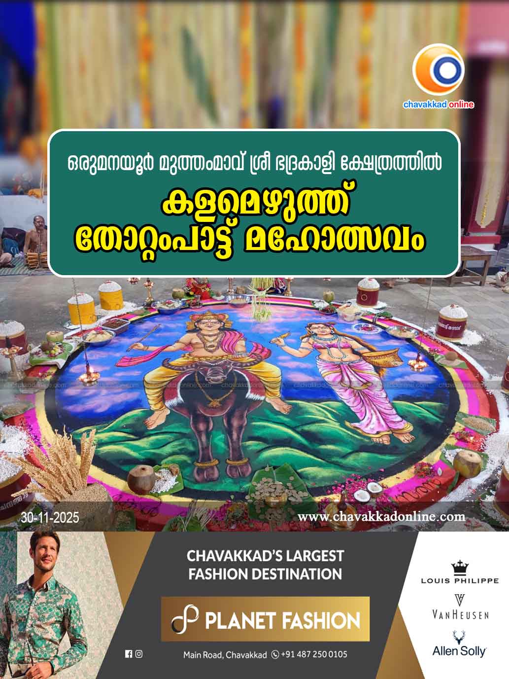 ചാവക്കാട് : ഒരുമനയൂർ മുത്തം മാവ് ശ്രീ ഭദ്രകാളി ക്ഷേത്രത്തിലെ കളമെഴുത്ത് തോറ്റംപാട്ട് മഹോത്സവം വിവിധ പരിപാടികളോടെ ആഘോഷിച്ചു. അഷ്ട നാഗ ക്കളം, ഭൂതക്കളം, മുത്തപ്പന് രൂപകളം, വിഷ്ണുമായക്ക് രൂപകളം, ഭഗവതിക്ക് രൂപകളം എന്നിവയായിരുന്നു പരിപാടികൾ. അന്നദാനവുമുണ്ടായിരുന്നു.