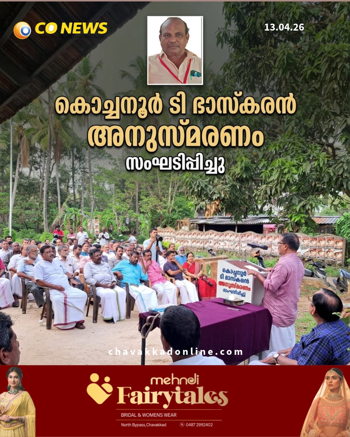 വടക്കേക്കാട്: സി പി ഐ വടക്കേക്കാട് ലോക്കൽ അസി. സെക്രട്ടറിയും കിസാൻ സഭ ഗുരുവായൂർ മേഖല പ്രസിഡൻ്റും സാമൂഹ്യ പ്രവർത്തകനുമായിരുന്നകൊച്ചനൂർ ടി ഭാസ്കരൻ അനുസ്മരണ സമ്മേളനം പൂമുഖം സാംസ്കാരിക വേദിയിൽ നടന്നു. സി പി ഐ മണ്ഡലം കമ്മിറ്റിഅഗം വി. എം മനോജ് അധ്യക്ഷത വഹിച്ചു. സംസ്ഥാന സെക്രട്ടേറിയറ്റ് അംഗം കെ കെ വത്സരാജ് മുഖ്യ പ്രഭാഷണം നടത്തി.മുൻ എം എൽ എ ഗീത ഗോപി, വാർഡ് അംഗം സലിം, നാടക പ്രവർത്തകരായ ബാബു വൈലത്തൂർ, സുഗതൻ മാസ്റ്റർ, പുന്നയൂർക്കുളം പ്രസ് ക്ലബ്ബ് സെക്രട്ടറി ഐ ബി അബ്ദുറഹ്മാൻ, എഴുത്തുകാരൻ ഹനീഫ് കൊച്ചനൂർ, സലിം കുമാർ മാസ്റ്റർ, ശ്രീധരൻ മാക്കാലിക്കൽ, വിദ്യാധരൻ, ഉണ്ണികൃഷ്ണൻ തിരുവളയന്നൂർ, അശ്റഫ് പേങ്ങാട്ടയിൽ, പ്രവീൺ പ്രസാദ്, പ്രേംരാജ് ചുണ്ടാലത്ത്, ബാലചന്ദ്രൻ മാസ്റ്റർ, കെ.കെ ജ്യോതിരാജ്, എം.എം സതീന്ദ്രൻ എന്നിവർ സംസാരിച്ചു.