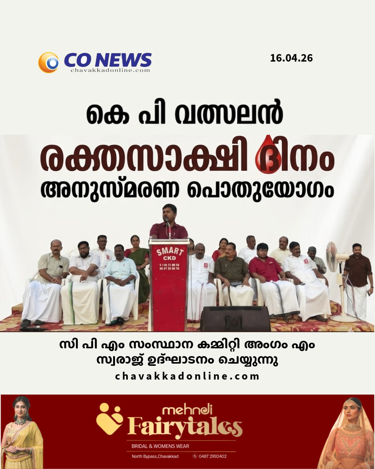 ചാവക്കാട്: കെ പി വത്സലന്റെ ഇരുപതാം രക്തസാക്ഷിത്വ ദിനവും അനുസ്മരണ പൊതുയോഗവും സംഘടിപ്പിച്ചു. ചാവക്കാട് കൂട്ടുങ്ങൽ ചത്വരത്തിൽ നടന്ന പൊതുയോഗം സി പി എം സംസ്ഥാന കമ്മിറ്റി അംഗം എം സ്വരാജ് ഉദ്ഘാടനം ചെയ്തു.