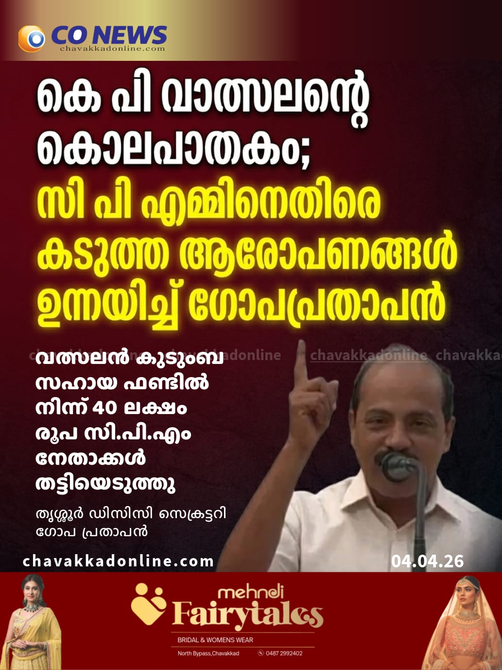 ചാവക്കാട് : കെ പി വാത്സലന്റെ കൊലപാതകവുമായി ബന്ധപ്പെട്ട് സി പി എമ്മിനെതിരെ കടുത്ത ആരോപണങ്ങൾ ഉന്നയിച്ച് ഡി സി സി സെക്രട്ടറി ഗോപ പ്രതാപൻ. തിരുവത്ര നടന്ന ചാവക്കാട് മുൻസിപ്പൽ വെസ്റ്റ് മേഖല യു ഡി എഫ് തിരഞ്ഞെടുപ്പ് കൺവെൻഷനിൽ മുഖ്യ പ്രഭാഷണം നിർവഹിക്കുകയായിരുന്നു അദ്ദേഹം. കെ.പി. വത്സന്റെ കൊലപാതകത്തെ തുടർന്ന് സി .പി.എം 75 ലക്ഷം രൂപ കുടുംബത്തിനു വേണ്ടി പിരിച്ചെടുത്തു.ഇതിൽ 35 ലക്ഷം രൂപ മാത്രമാണ് വത്സന്റെ കുടുംബത്തിന് നൽകിയത്.ബാക്കി 40 ലക്ഷം രൂപ സി.പി.എം നേതാക്കൾ തട്ടിയെടുത്തുവെന്നാണ് ആരോപണം. കുടുംബത്തിന് ലഭിച്ച പണം മണത്തല സർവീസ് സഹകരണ ബാങ്കിൽ നിക്ഷേപിക്കുകയായിരുന്നു. എന്നാൽ അതിന്റെ പലിശ പോലും വാത്സലന്റെ മകൻ നിരഞ്ജന്റെ വിദ്യാഭ്യാസത്തിനോ കുടുംബത്തിനോ നൽകാൻ സി.പി.എം തയ്യാറായില്ല. ജില്ലാ സെക്രട്ടറി കെ.വി. അബ്ദുൾ ഖാദറുമായി നിരഞ്ജൻ കലഹിച്ചപ്പോഴാണ് പണത്തിന്റെ കാര്യത്തിൽ മാറ്റമുണ്ടായത്.അങ്ങനെ നിക്ഷേപവും പലിശയും ചേർന്ന് ബാങ്കിലുണ്ടായിരുന്ന 60 ലക്ഷത്തോളം രൂപ സി.പി.എം ഇടപെട്ട് ‘ഫാം ഫെഡ്’ (Farm Fed) എന്ന സ്ഥാപനത്തിൽ നിക്ഷേപിപ്പിച്ചു.പിന്നീട് ഈ സ്ഥാപനം തകരുകയും നിരഞ്ജന് ആ പണം നഷ്ടമാവുകയും ചെയ്തു. മുൻ മുൻസിപ്പൽ ചെയർപേഴ്സൺ സതീരത്നത്തിന്റെയും മറ്റ് സി.പി.എം നേതാക്കളുടെയും ലക്ഷക്കണക്കിന് രൂപ ഇത്തരത്തിൽ നഷ്ടപ്പെട്ടിട്ടുണ്ടെന്നും പ്രസംഗത്തിൽ ആരോപിക്കുന്നുണ്ട്.ഈ പണം തിരികെ ചോദിച്ചപ്പോൾ സി.പി.എം സഹായിക്കാത്തതിനാൽ നിരഞ്ജൻ ലീഗ് നേതാവ് കുഞ്ഞാലിക്കുട്ടിയെയും ചാവക്കാട്ടെ യു .ഡി.എഫ് നേതൃത്വത്തെയും സമീപിച്ചതായി ഗോപ പ്രതാപൻ പറഞ്ഞു. സ്വന്തം പാർട്ടി തന്നെ ചതിച്ചു, അതുകൊണ്ട് അച്ഛന്റെ പാർട്ടിയോട് മധുരമായി പ്രതികാരം ചെയ്യണം’ എന്ന് അവൻ ആവർത്തിച്ചു പറഞ്ഞതായി ഗോപ പ്രതാപൻ പറയുന്നു.യു.ഡി.എഫ് സഹായിക്കാൻ തയ്യാറായപ്പോൾ സി.പി.എം നിരഞ്ജനെ സ്വാധീനിക്കുകയും നിരഞ്ജനെ ഉപയോഗിച്ച് സി എച്ച് റഷീദിനെതിരെ വ്യാജപ്രചാരണം നടത്തുകയുമാണ് ഇപ്പോൾ ചെയ്യുന്നത്. സി എച്ച് റഷീദിന്റെ ഗൂഢാലോചന മൂലമാണ് കെ.പി വത്സൻ കൊല്ലപ്പെട്ടതെന്ന് ആരോപിക്കുന്ന നിരഞ്ജന്റെ ഫേസ്ബുക്ക് പോസ്റ്റ് ഇപ്പോൾ ചർച്ചയായിട്ടുണ്ട്.സി.എച്ച് റഷീദിന്റെ ഗൂഢാലോചന മൂലമാണ് കെ.പി വത്സൻ കൊല്ലപ്പെട്ടതെന്ന് ഇ.പി ജയരാജനാണ് അന്ന് ആദ്യം പറഞ്ഞത്. എന്നാൽ എഫ്.ഐ.ആറിലോ കുറ്റപത്രത്തിലോ സി.എച്ച് റഷീദിന്റെ പേര് പരാമർശിച്ചിരുന്നില്ല. 2006-ലെ ഈ കൊലപാതകത്തിന് ശേഷം വന്ന അച്യുതാനന്ദൻ ഗവൺമെന്റ് പോലും പുനരന്വേഷണം നടത്തി സി.എച്ച് റഷീദിന് ഇതിൽ പങ്കുണ്ടെന്ന് പറഞ്ഞിട്ടില്ല. ഇതിനുശേഷം 2016 മുതൽ 2026 വരെ കേരളം ഭരിച്ചുകൊണ്ടിരിക്കുന്ന പിണറായി സർക്കാർ പോലും ഈ കൊലപാതകത്തിൽ ഒരു പുനരന്വേഷണത്തിന് തയ്യാറായിട്ടില്ല. എന്നിട്ടാണ