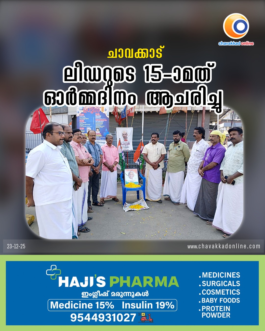 ചാവക്കാട് : കേരള രാഷ്ട്രീയത്തിലെ ലീഡർ കെ കരുണാകരന്റെ പതിനഞ്ചാമത് ഓർമ്മ ദിനത്തിൽ ചാവക്കാട് ഐഎൻടിയുസി ചാവക്കാട് മണ്ഡലം കമ്മിറ്റിയുടെ നേതൃത്വത്തിൽ പുഷ്പാർച്ചനയും അനുസ്മരണവും നടന്നു ഐഎൻടിയുസി ജില്ലാ സെക്രട്ടറി എം എസ് ശിവദാസ് ഉദ്ഘാടനം ചെയ്തു. ഐഎൻടിയുസി മോട്ടോർ ഫെഡറേഷൻ പ്രസിഡന്റ് ആർ എം റൗഫ് അധ്യക്ഷ വഹിച്ചു.