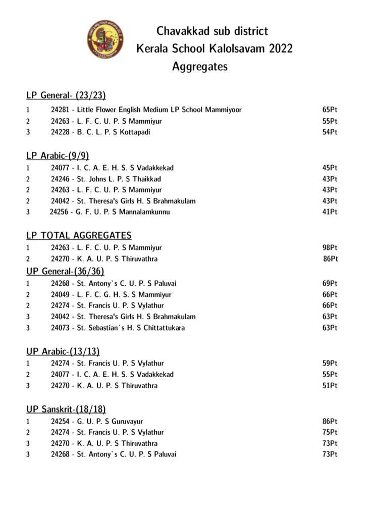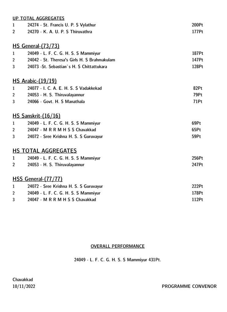 എൽ പി വിഭാഗത്തിൽ 98 പോയിന്റ് നേടി എൽ എഫ് സി യു പി സ്കൂൾ മമ്മിയൂരും ജേതാക്കളായി.