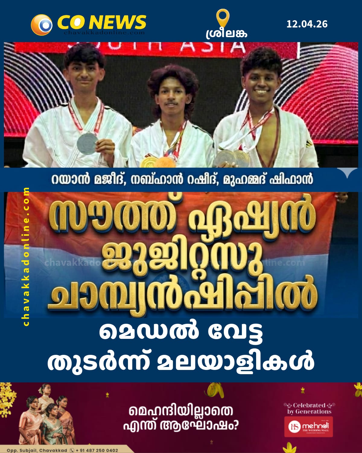 ചാവക്കാട് : സൗത്ത് ഏഷ്യൻ ജുജിറ്റ്സു ചാമ്പ്യൻഷിപ്പിൽ മെഡൽ വേട്ട തുടർന്ന് മലയാളി വിദ്യാർത്ഥികൾ. ശനി, ഞായർ ദിവസങ്ങളിലായി ശ്രീലങ്കയിൽ നടന്നുവന്ന സൗത്ത് ഏഷ്യൻ ജുജിറ്റ്സു ചാമ്പ്യൻഷിപ്പിലാണ് 18 വയസിനു താഴെയുള്ളവരുടെ വിഭാഗത്തിൽ തൃശ്ശൂരിൽ നിന്നുള്ള കായിക താരങ്ങൾ മെഡലുകൾ വാരിക്കൂട്ടിയത്.