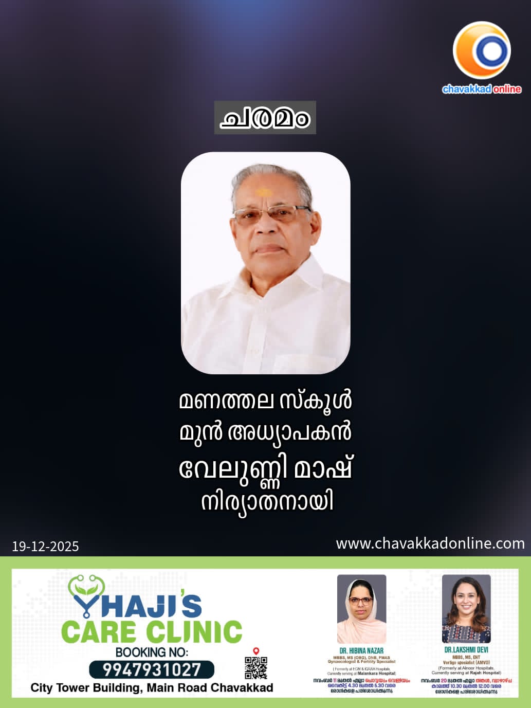 മണത്തല സ്കൂൾ മുൻ അധ്യാപകൻ വേലുണ്ണി മാഷ് നിര്യാതനായി