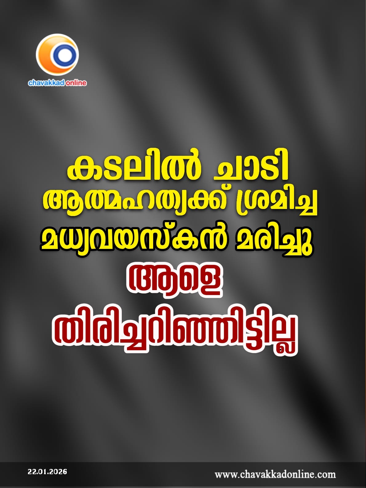 ചാവക്കാട്: കടലിൽ ചാടി ആത്മഹത്യക്ക് ശ്രമിച്ച മധ്യവയസ്കൻ മരിച്ചു. ഇന്ന് വ്യാഴാഴ്ച്ച രാത്രി എട്ടുമണിയോടെ ചാവക്കാട് ബീച്ചിലാണ് സംഭവം. കടയിലേക്ക് ഒരാൾ നടന്നു പോവുന്നത് കണ്ട ബ്ലങ്ങാട് സ്വദേശി രമേശ് ഇയാളെ കരക്കെത്തിച്ചെങ്കിലും അവശനിലയിലായിരുന്നു.. പിന്നീട് 101 ആംബുലൻസിന്റെ സഹായത്തോടെ ചാവക്കാട് ഹയാത് ആശുപത്രിയിൽ എത്തിച്ചെങ്കിലും മരണം സംഭവിച്ചിരുന്നു. ഏകദേശം 48 വയസ്സ് പ്രായം തോന്നിക്കുന്ന ഇയാളെ തിരിച്ചറിഞ്ഞിട്ടില്ല. ചാരകളർ മുണ്ടും ക്രീം കളർ ഡിസൈനുകളുള്ള ഷർട്ടും അരയിൽ നീല ബെൽറ്റും ധരിച്ചിട്ടുണ്ട്. മൃതദേഹം ഹയാത് ആശുപത്രി മോർച്ചറിയിൽ.