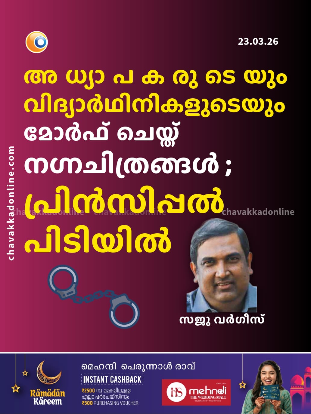 വെ​സ്റ്റ് മ​ങ്ങാ​ട് സെ​ന്റ് ജോ​സ​ഫ് ആ​ൻ​ഡ് സെ​ന്റ് സി​റി​ൾ​സ് ഹ​യ​ർ സെ​ക്ക​ൻ​ഡ​റി സ്കൂ​ളി​ലെ ഹ​യ​ർ സെ​ക്ക​ൻ​ഡ​റി വി​ഭാ​ഗം പ്രി​ൻ​സി​പ്പ​ൽ ഡോ. ​സ​ജു വ​ർ​ഗീ​സാ​ണ് അ​റ​സ്റ്റി​ലാ​യ​ത്.