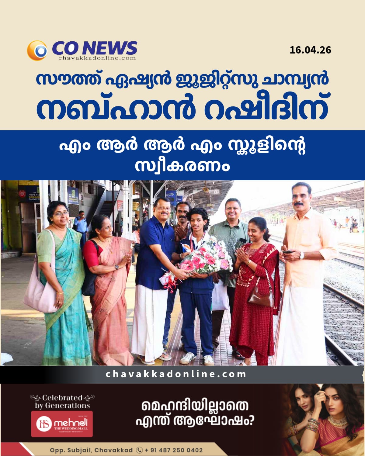 ചാവക്കാട്: ശ്രീലങ്കയിൽ വെച്ച് നടന്ന സൗത്ത് ഏഷ്യൻ ജൂജിറ്റ്സു ചാമ്പ്യൻഷിപ്പ് വിഭാഗത്തിൽ ഇന്ത്യക്ക് വേണ്ടി സ്വർണ്ണ മെഡലും, ഫൈറ്റ് വിഭാഗത്തിൽ വെങ്കല മെഡലും കരസ്ഥമാക്കിയ ഒരുമനയൂർ സ്വദേശി നബ്ഹാൻ റഷീദിന് റെയിൽവേ സ്റ്റേഷനിൽ ചാവക്കാട് എം ആർ ആർ എം സ്കൂൾ അധികൃതരും