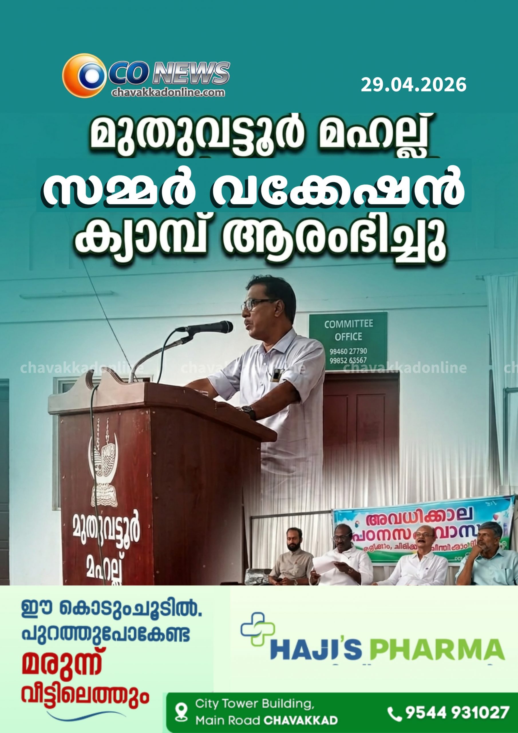 ചാവക്കാട് : മുതുവട്ടൂർ മഹല്ല് കമ്മിറ്റി യുടെ ദീനി ബോധവൽക്കരണ സമിതിയുടെ ആഭിമുഖ്യത്തിലുള്ള സമ്മർ വക്കേഷൻ ക്യാമ്പ് ആരംഭിച്ചു.ചാവക്കാട് മുനിസിപ്പൽ ചെയർപേഴ്സൺ എ.എച്ച്.അക്ബർ ഉദ്ഘാടനം ചെയ്തു. മഹല്ല് പ്രസിഡണ്ട് ഹസീബ് അധ്യക്ഷത വഹിച്ചു. എഴുത്തുകാരൻ സാജിദ് ആറാട്ടുപുഴ മുഖ്യപ്രഭാഷണം നിർവഹിച്ചു. മഹല്ല് ഖാസി സുലൈമാൻ അസ്ഹരി, ട്രഷറർ ടി. എസ്. നിസാമുദ്ദീൻ, മുസ്തക്കീ എന്നിവർ പ്രസംഗിച്ചു. സൗമ്യ എം.എസ്. റെനീഷ് മുഹമ്മദ് എന്നിവർ വിവിധ ക്ലാസുകൾക്ക് നേതൃത്വം നൽകി.