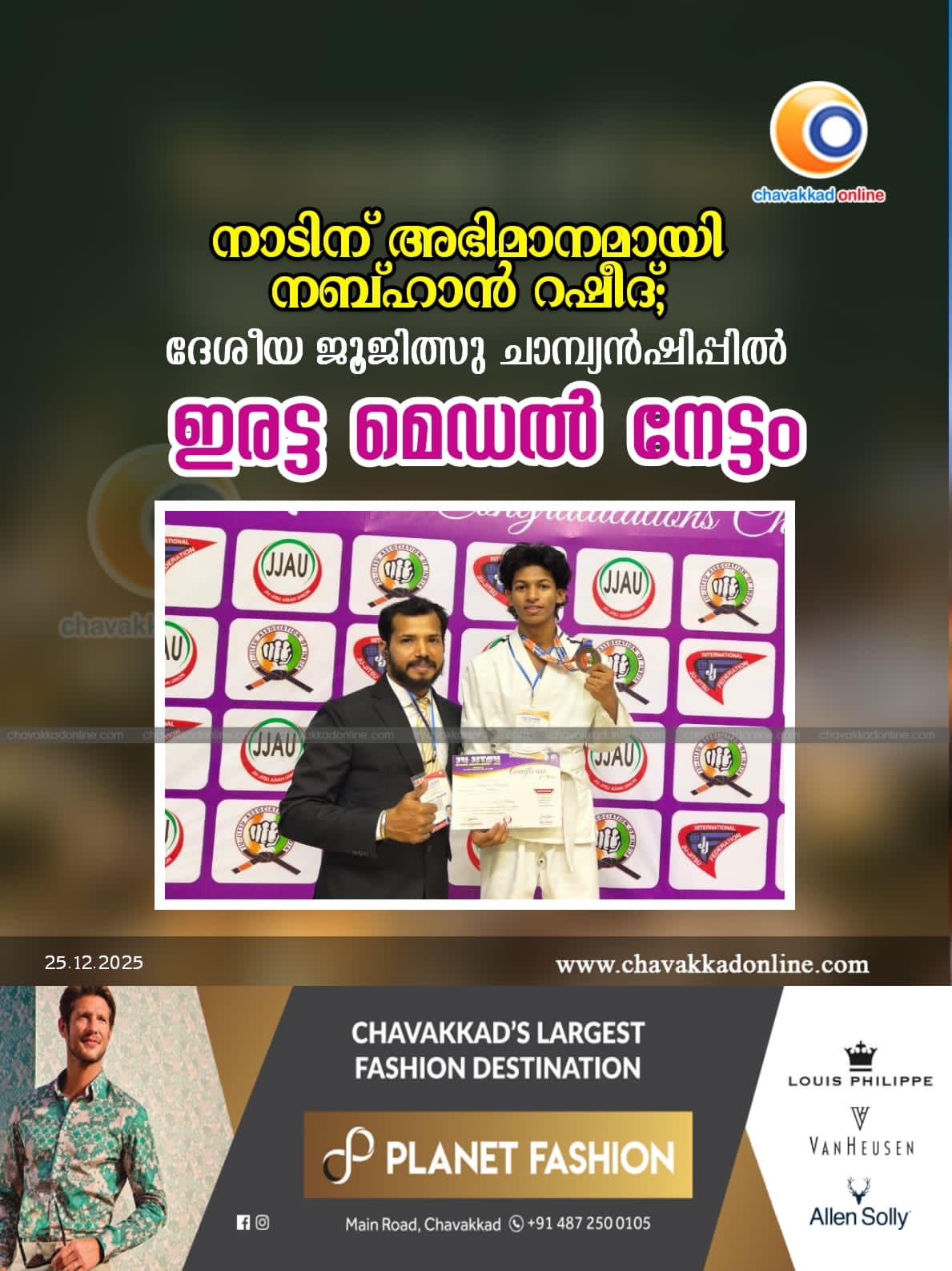 നാടിന് അഭിമാനമായി നബ്ഹാൻ റഷീദ്;ദേശീയ ജൂജിത്സു ചാമ്പ്യൻഷിപ്പിൽ ഇരട്ട മെഡൽ നേട്ടം