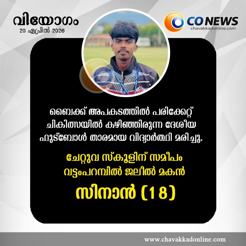 ചേറ്റുവ : ബൈക്ക് അപകടത്തിൽ പരിക്കേറ്റ് ചികിത്സയിൽ കഴിഞ്ഞിരുന്ന ദേശീയ ഫുട്ബോൾ താരമായ വിദ്യാർത്ഥി മരിച്ചു. ചേറ്റുവ സ്‌കൂളിന്  സമീപം വട്ടംപറമ്പിൽ ജലീൽ മകൻ സിനാൻ (18) ആണ് മരിച്ചത്.  കഴിഞ്ഞ ശനിയാഴ്ച രാത്രി ബൈക്കിൽ നിന്നും തെറിച്ച് ദേശീയപാതയുടെ പാർശ്വഭിത്തിയിൽ തല ഇടിച്ചു പരിക്കേറ്റ് ചികിത്സയിലായിരുന്നു സിനാൻ.  തുടർന്ന് തൃശ്ശൂർ അശ്വിനി ഹോസ്പിറ്റലിൽ തീവ്ര പരിചരണ വിഭാഗത്തിൽ ചികിത്സയിലായിരുന്നു, ഇന്ന് വൈകുന്നേരം ആറുമണിയോടെയാണ് മരണം സ്ഥിരീകരിച്ചത്.