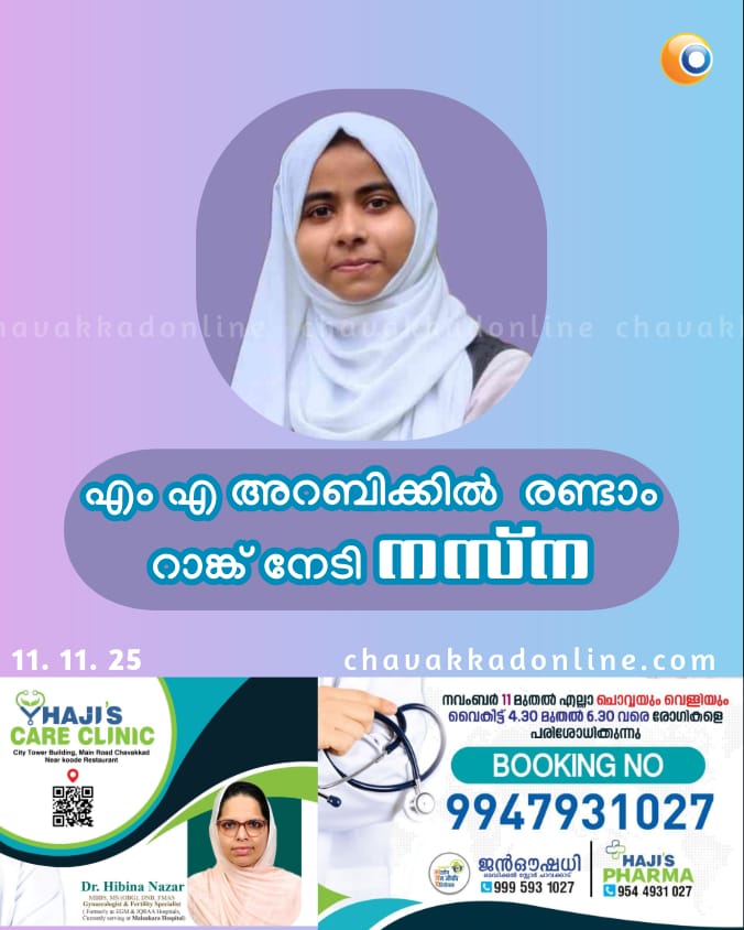 education എം എ അറബിക്കിൽ രണ്ടാം റാങ്ക് നേടി നസ്ന By From the desk Last updated Nov 11, 2025 Share അണ്ടത്തോട്: കാലിക്കറ്റ് യൂണിവേഴ്സിറ്റി അറബിക് എംഎ പരീക്ഷയിൽ രണ്ടാം റാങ്ക് നേടി അണ്ടത്തോട് സ്വദേശി വി. എൻ. നസ്ന. തിരൂർ തുഞ്ചൻ കോളേജ് വിദ്യാർത്ഥിയാണ്. മുക്കിലപീടികയിൽ ജസീനയാണ് മാതാവ്. AndathoduArabicCalicut universityRank holderThunchathTirur Share FacebookTwitterGoogle+ReddItWhatsAppPinterestEmail